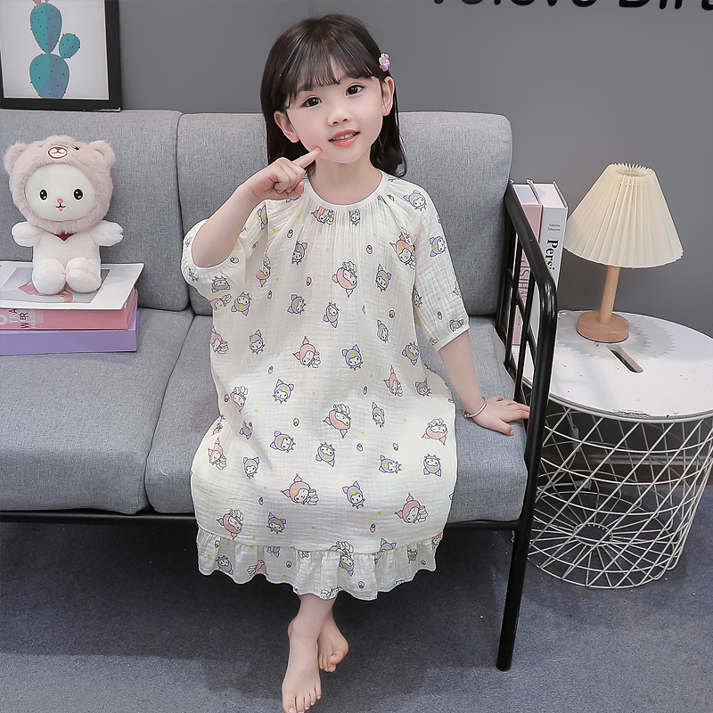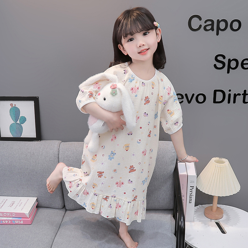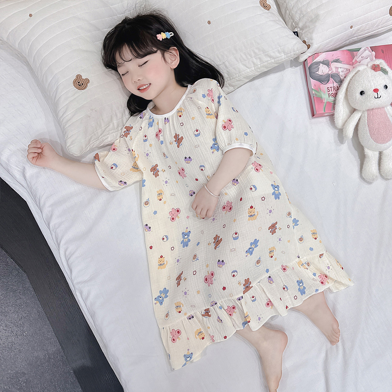 2025新款 儿童睡衣女孩春秋公主家居裙 女童睡裙纯棉纱布女宝宝半袖