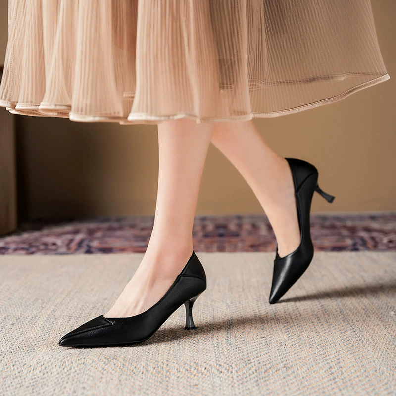 女 侧空红底裸色浅口气质单鞋 2025新款 细跟尖头漆皮名媛高跟鞋