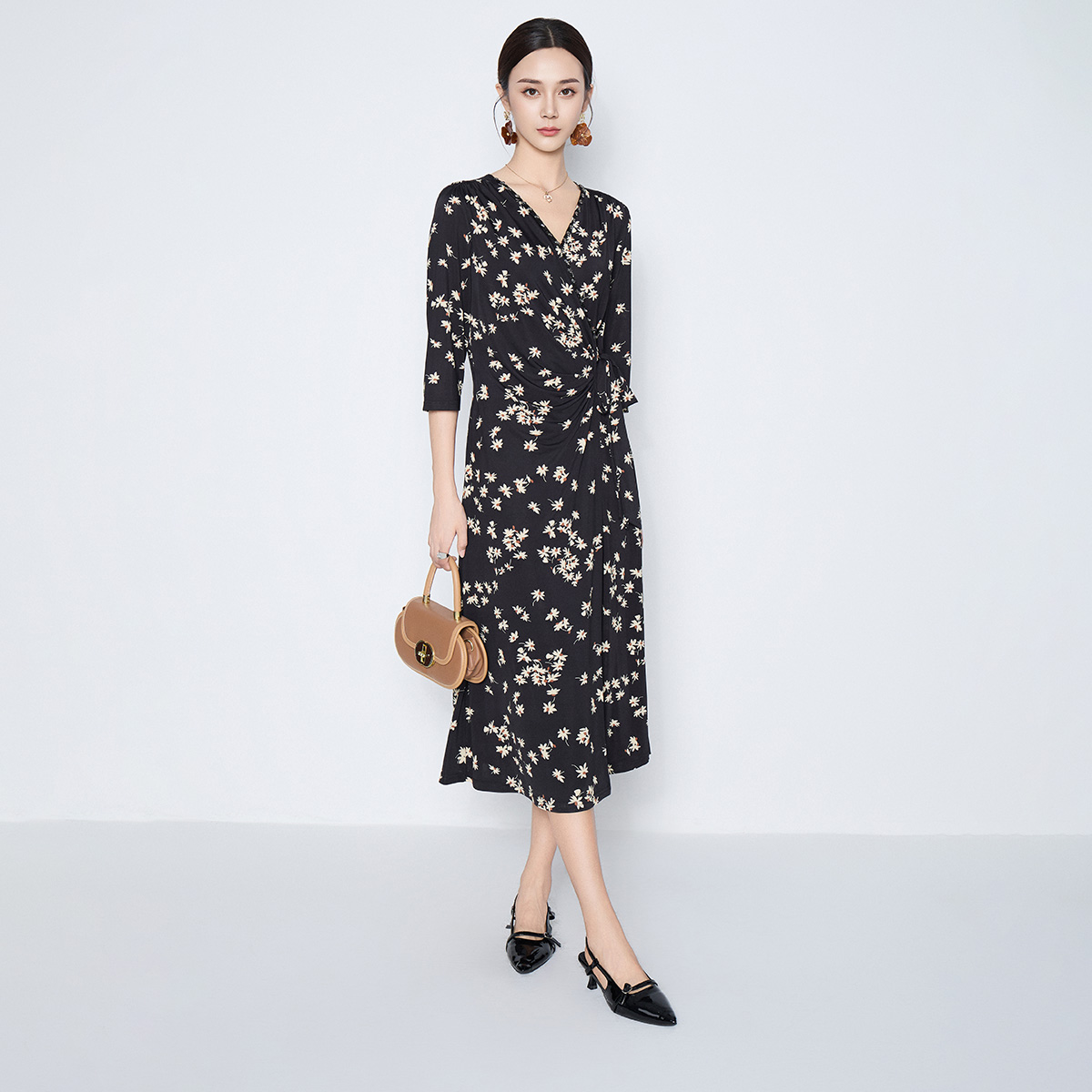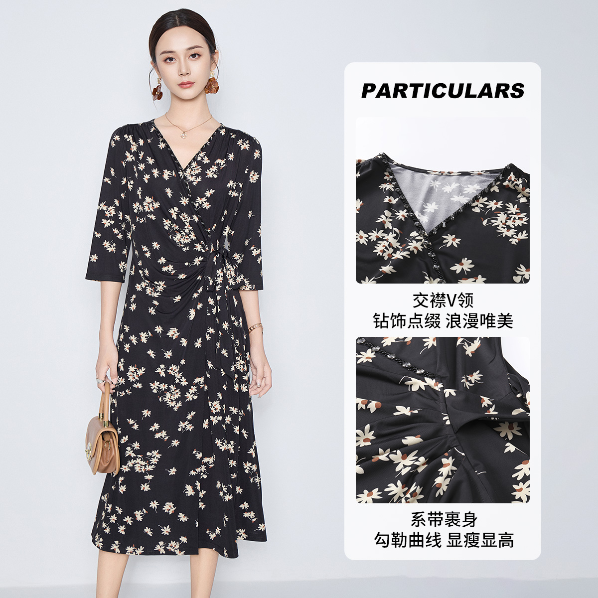 气质法式 黑色印花连衣裙子V领收腰系带时尚 女 新款 马天奴2025夏季