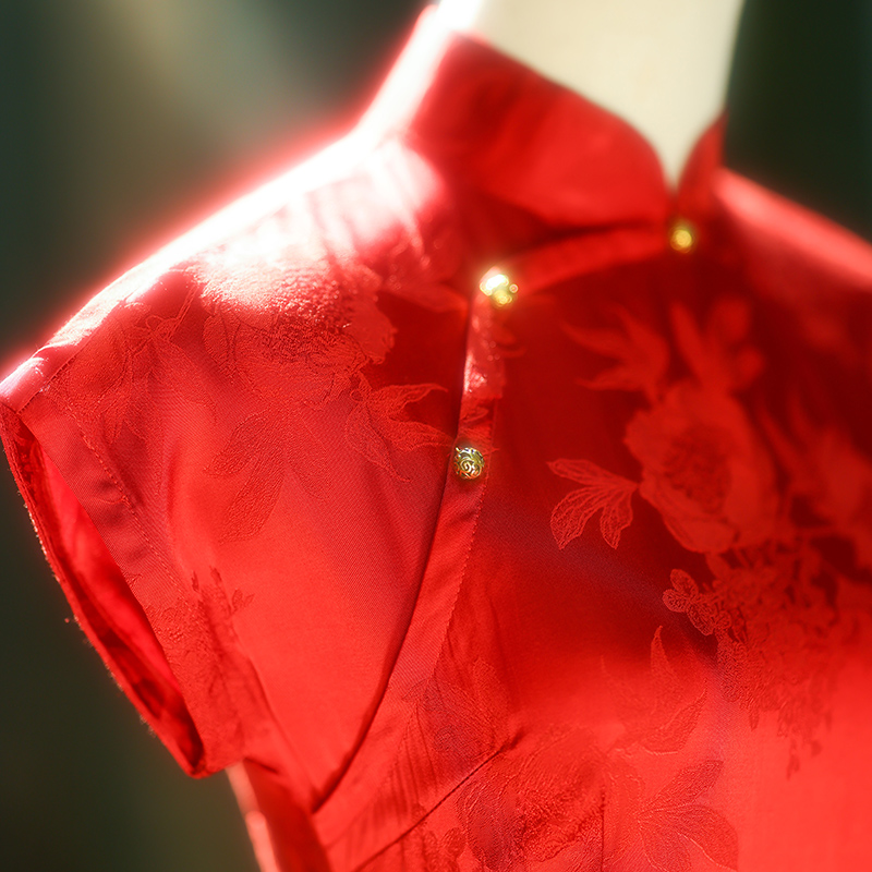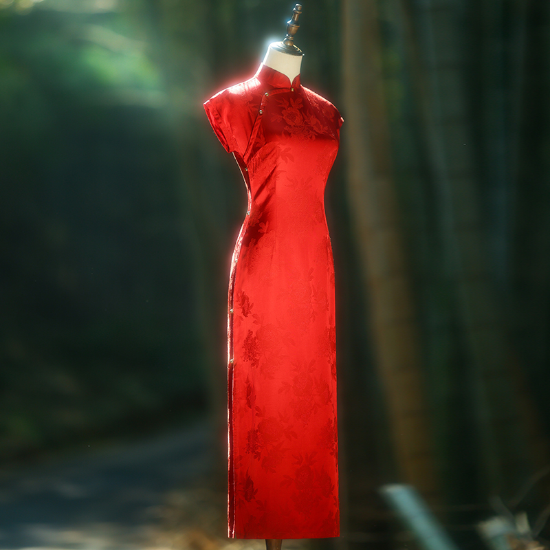 QS秸熙25夏季 轻国风收腰红色敬酒服晨袍连衣裙提花改良旗袍裙 新款