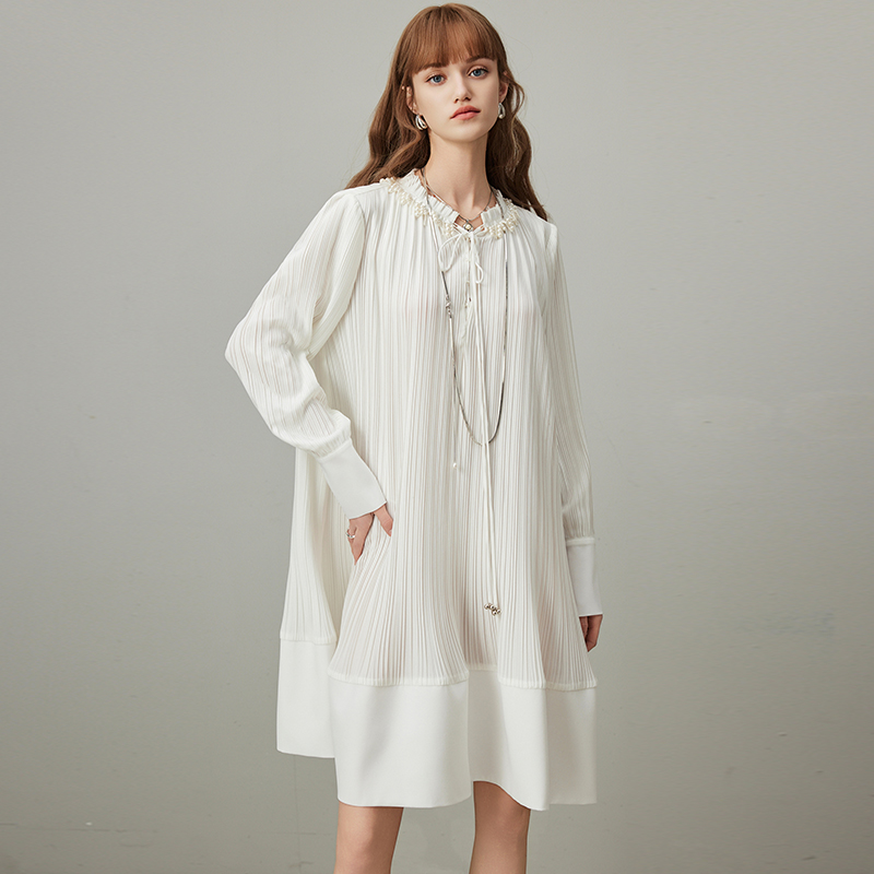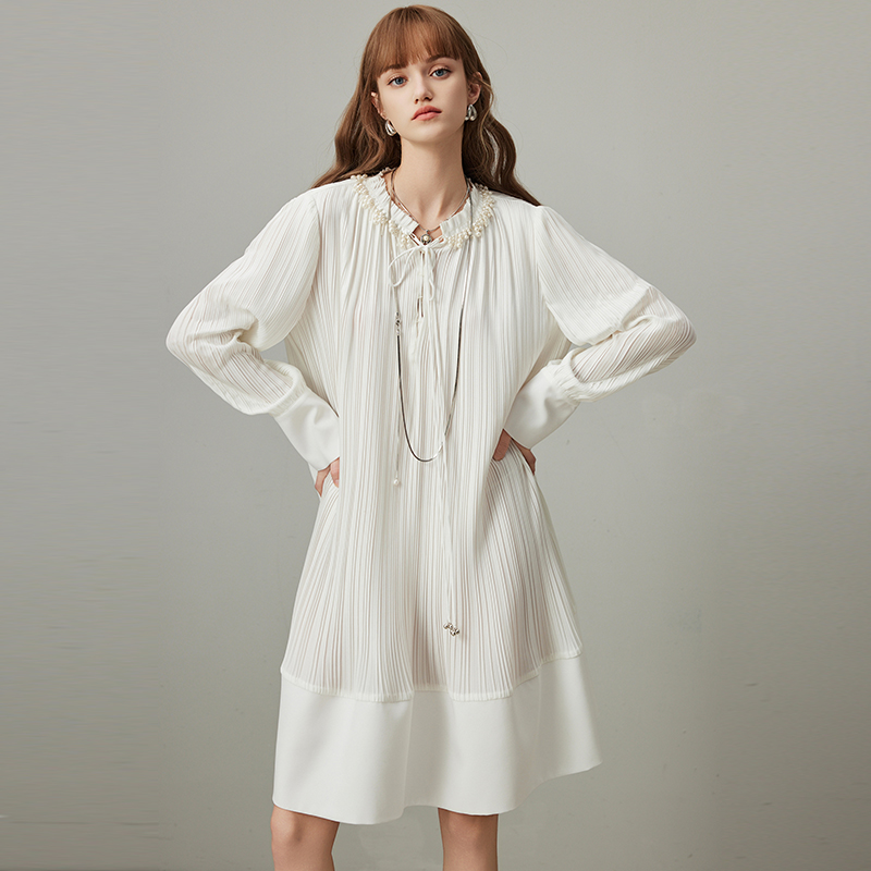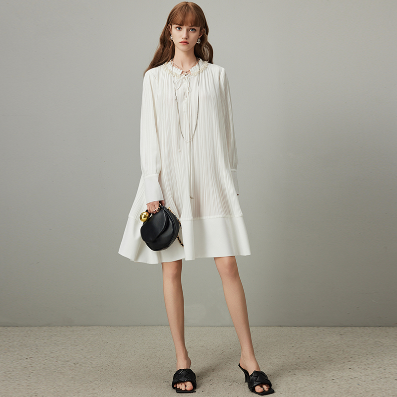 宽松显瘦裙子 小个子钉珠长袖 茗思高级感撞色连衣裙女2025秋季 新款