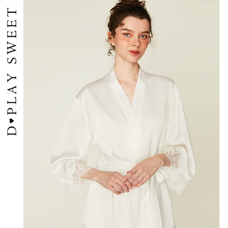 DPLAYSWEET法式 家居服 轻奢性感白色蕾丝缎面睡袍女士晨袍睡衣套装