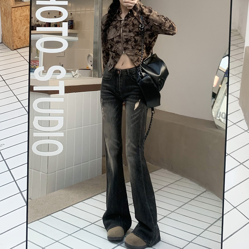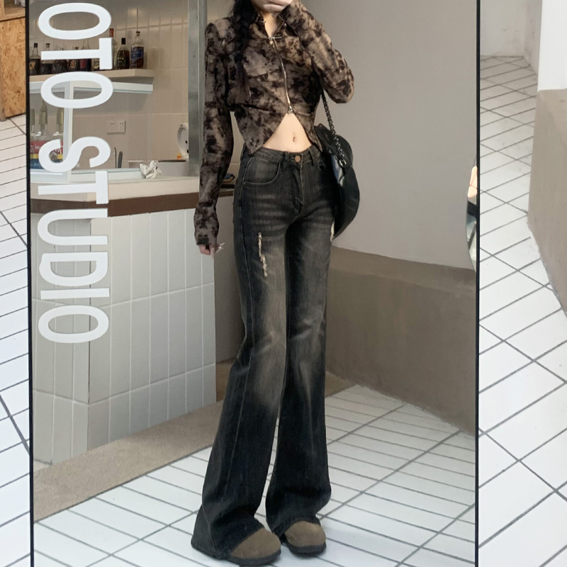 弹力马蹄裤 黑灰色高腰微喇叭牛仔裤 显瘦辣妹修身 新款 子 女2025春季
