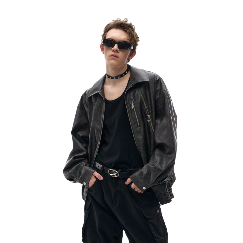 江南先生NewJNXS美式 男女休闲潮外套 复古分割结构PU皮衣夹克秋季
