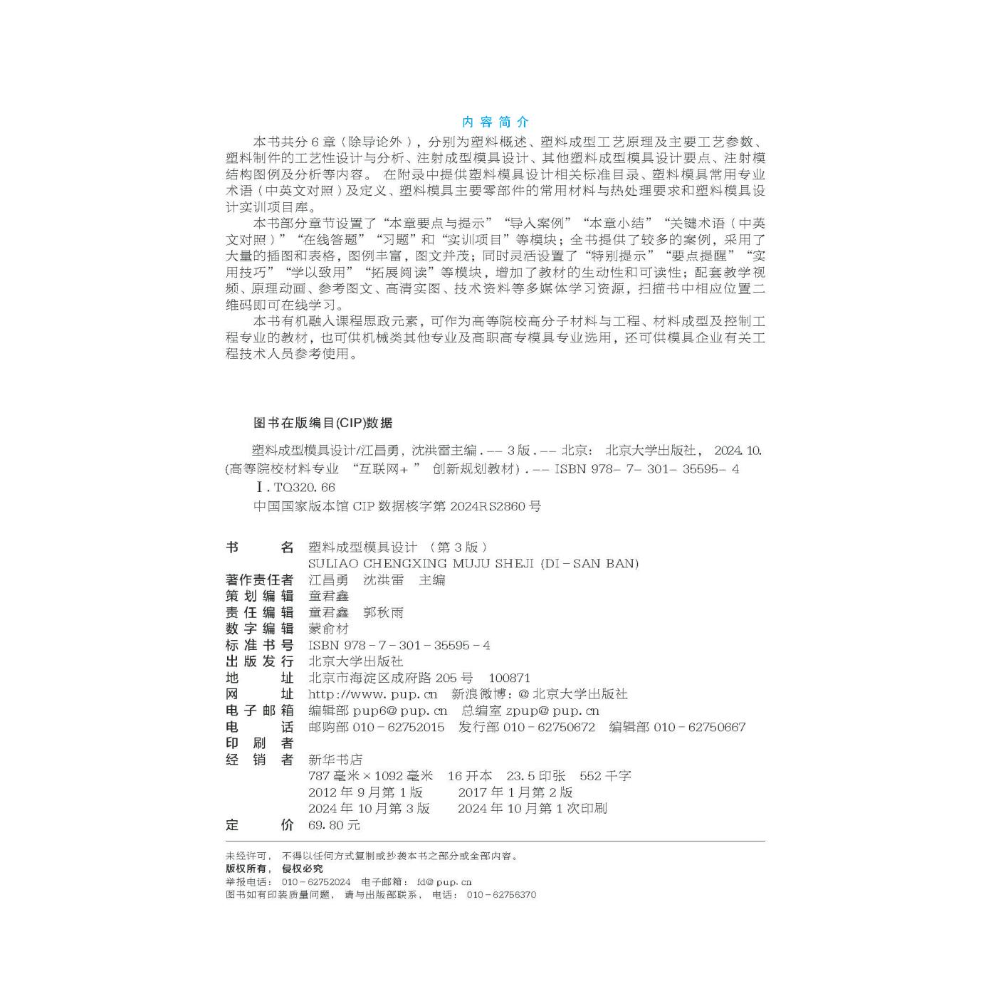 互联网 创新规划教材 社 第3版 9787301355954 北京大学出版 高等院校材料专业 沈洪雷 塑料成型模具设计 江昌勇