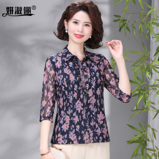 2025新款 秋装 台湾纱高贵夫人品牌上衣 小衫 中老年妈妈洋气印花衬衫