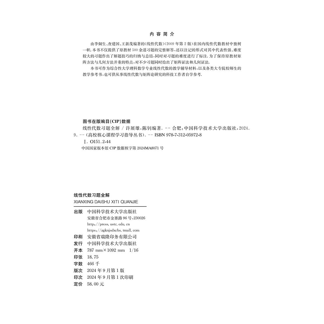 中科大 中国科学技术大学出版 线性代数习题全解 陈钊 社李烔生查建国线性代数教材配套习题解答解题技巧归纳总结 许展雄 官方正版