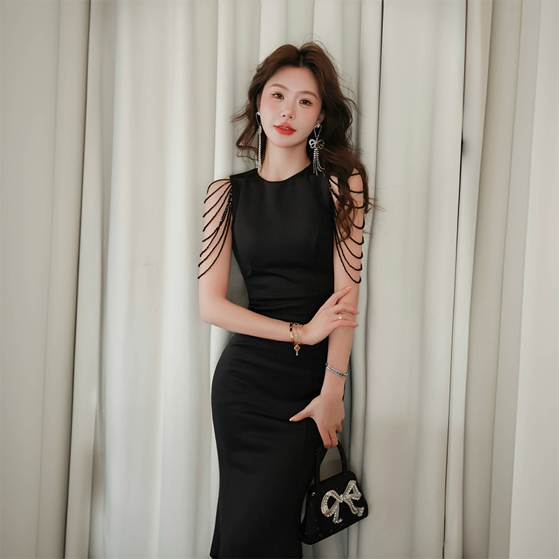 主持人宴会年会女 名媛气质连衣裙晚装 黑色晚礼服长款 鱼尾显瘦修身