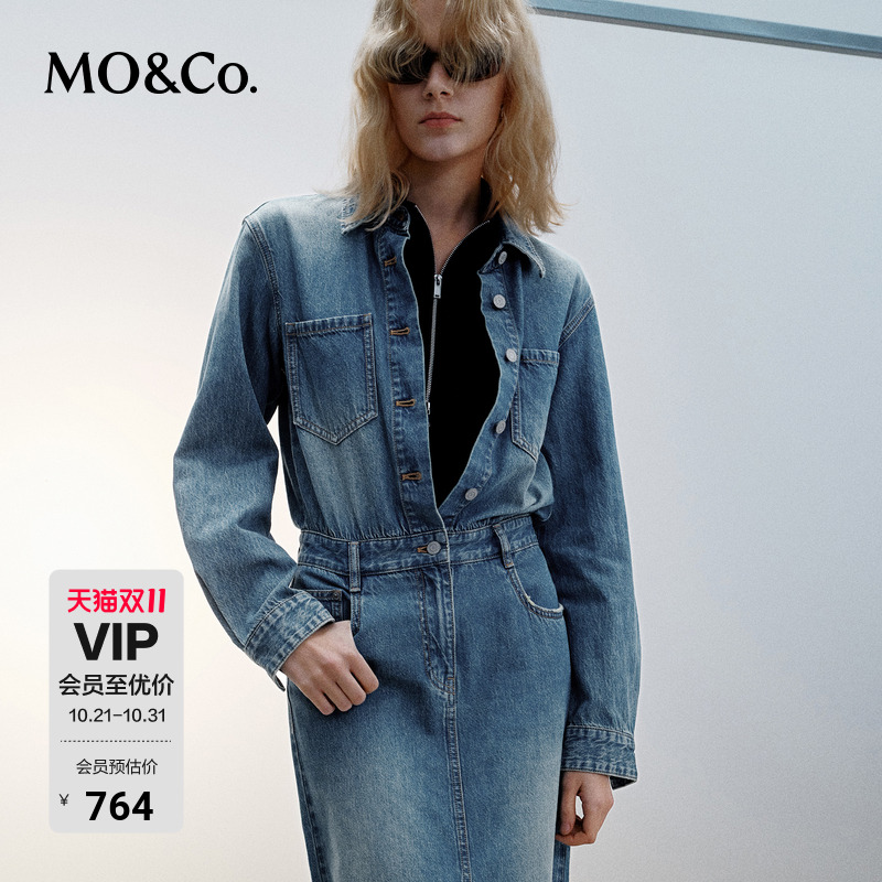 直筒洗旧磨白 牛仔连衣裙设计感高腰前后开叉长款 MOCO奥莱