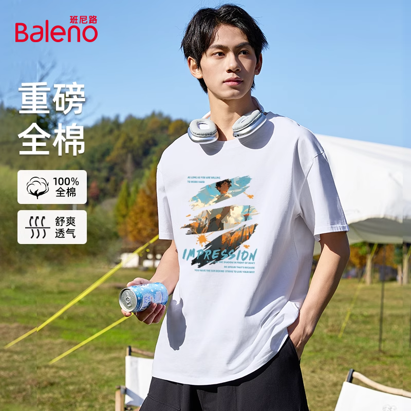 男士 纯棉潮牌半袖 圆领上衣服C 新款 班尼路黄色多巴胺t恤男2025夏季