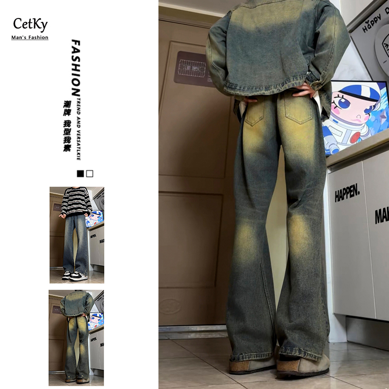 潮牌vibe宽松阔腿裤 查尔斯桃心 春秋季 男美式 渐变泼墨弯刀牛仔裤