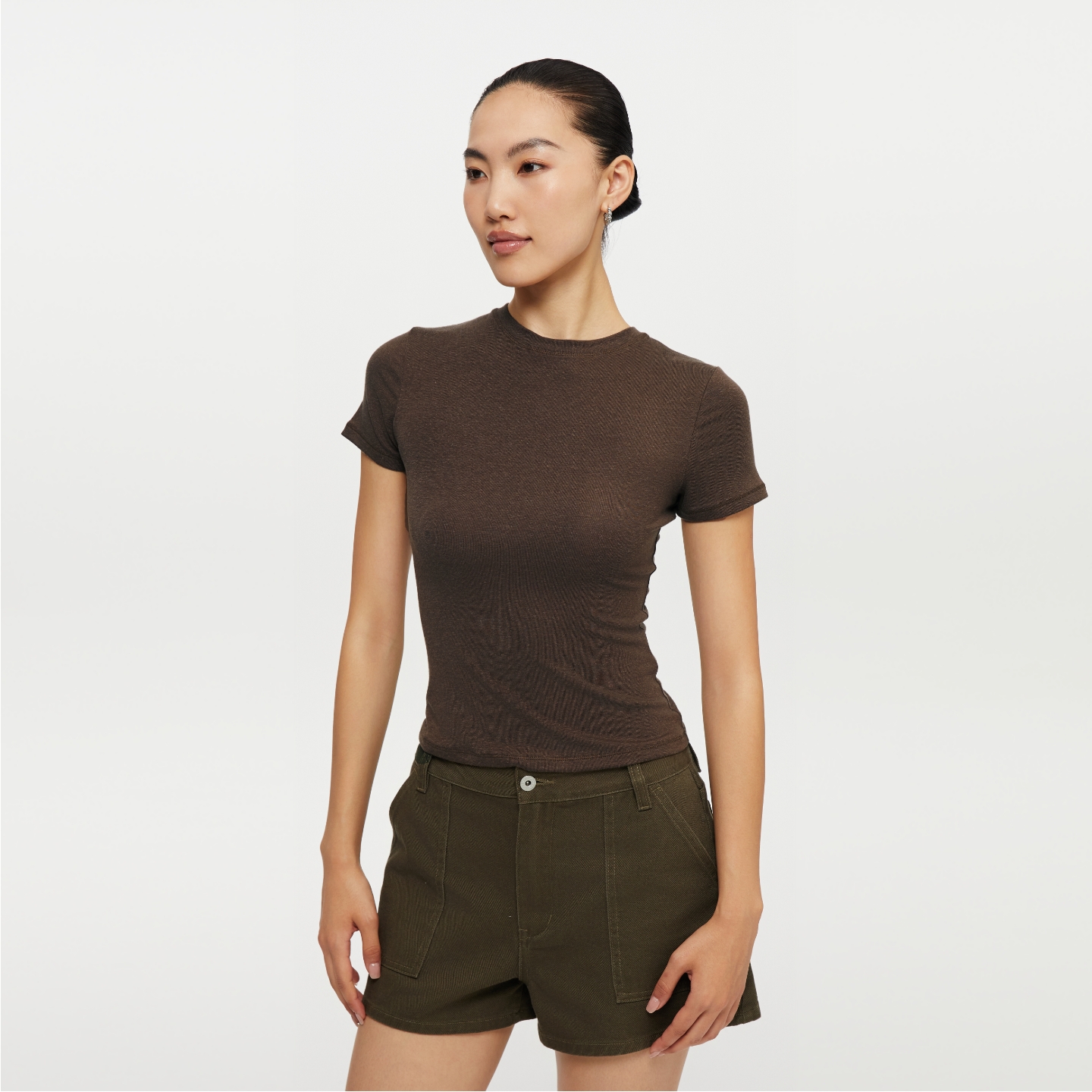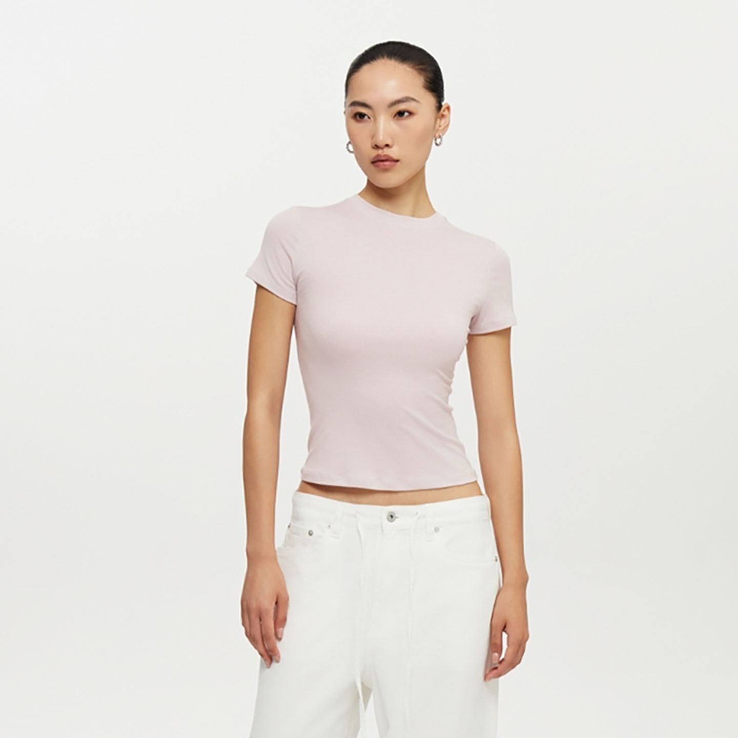 正肩纯色休闲运动亲肤透气上衣 t恤女夏美式 Oneup天丝亚麻修身 短袖