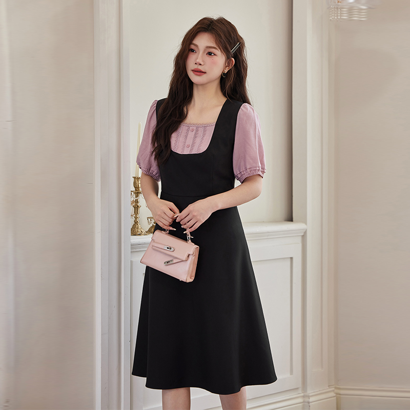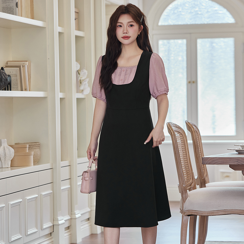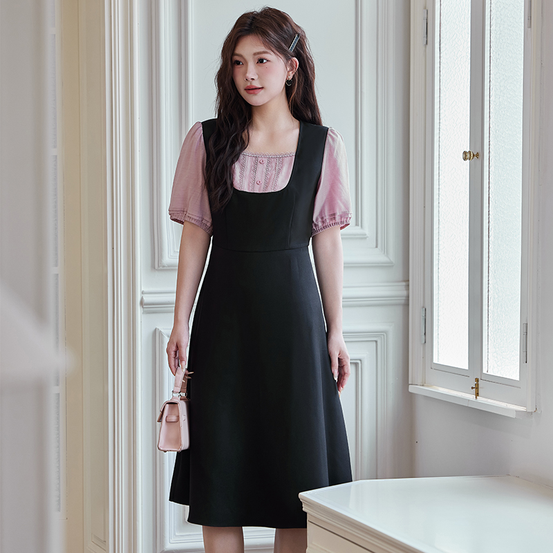 女装 绮娑大码 气质拼接假两件撞色A字长裙 新款 显瘦胖MM连衣裙夏季