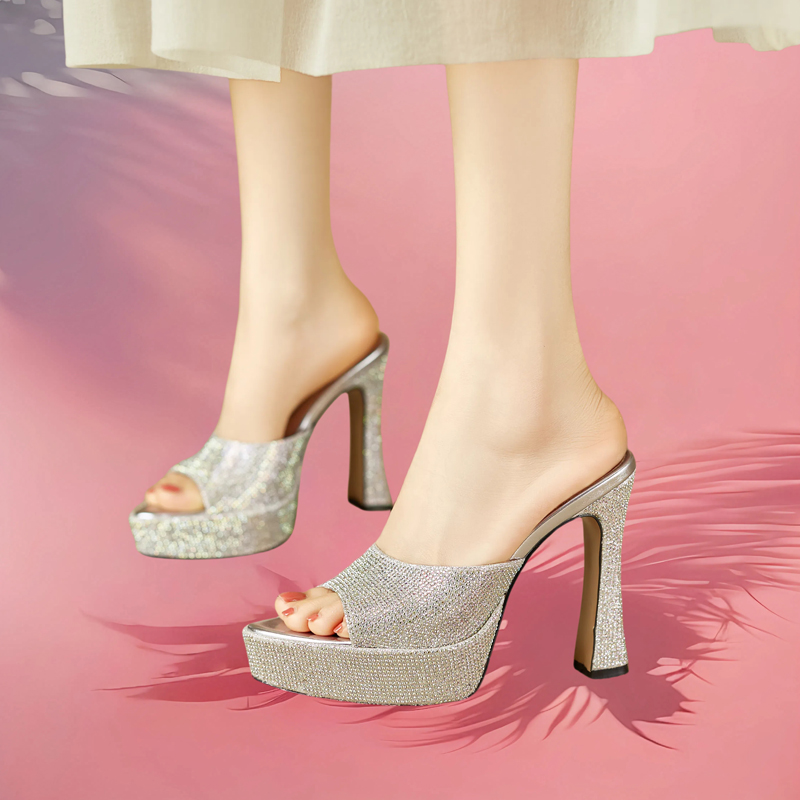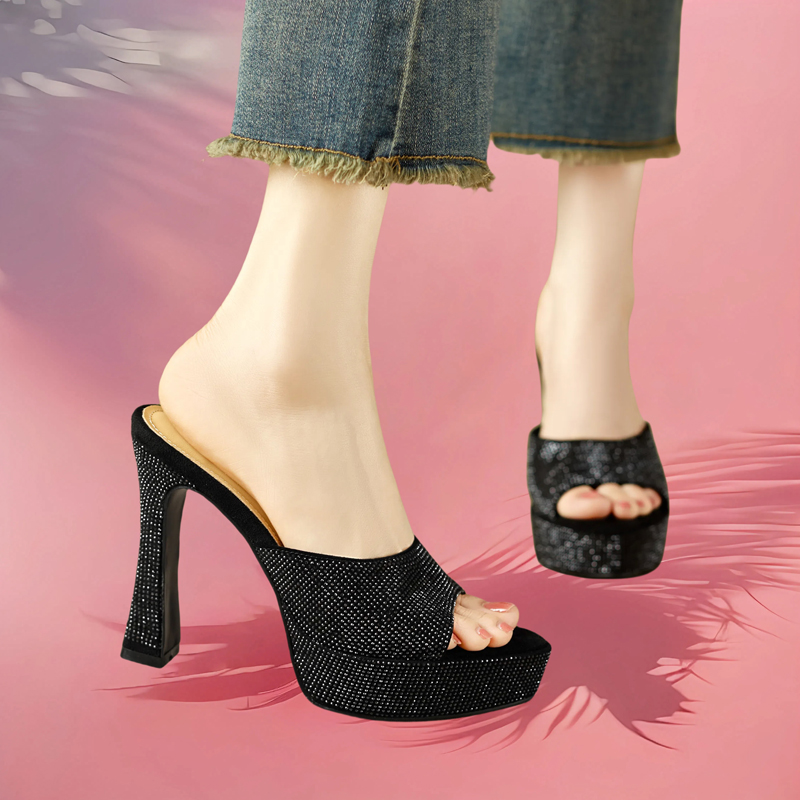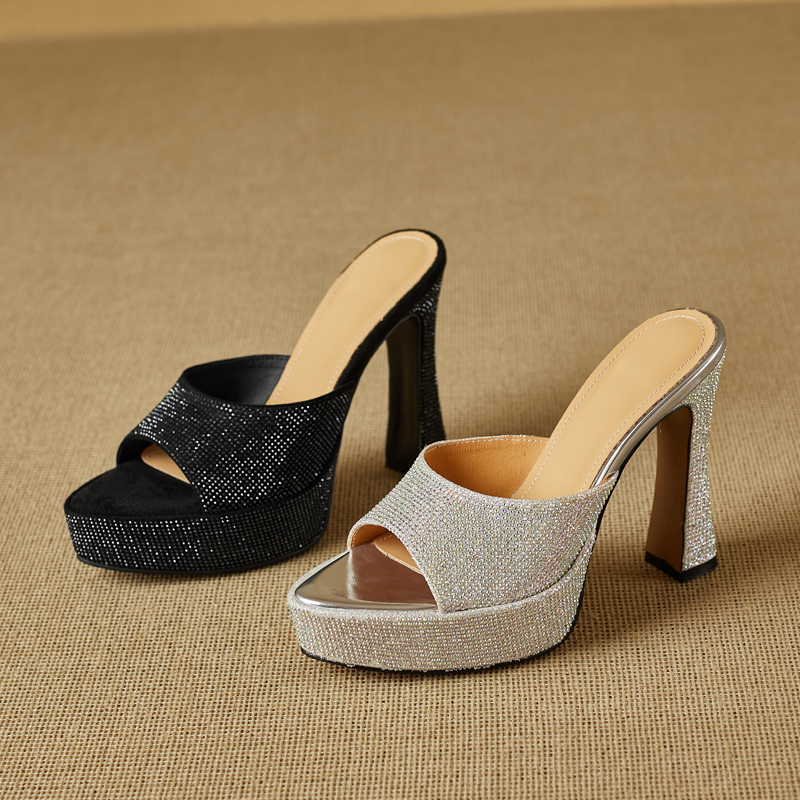 洋气设计感鱼嘴一字拖粗跟 外穿2025新款 水钻轻奢高跟凉拖鞋 女夏季