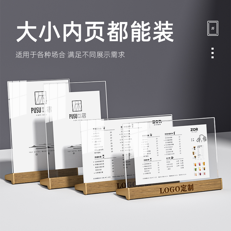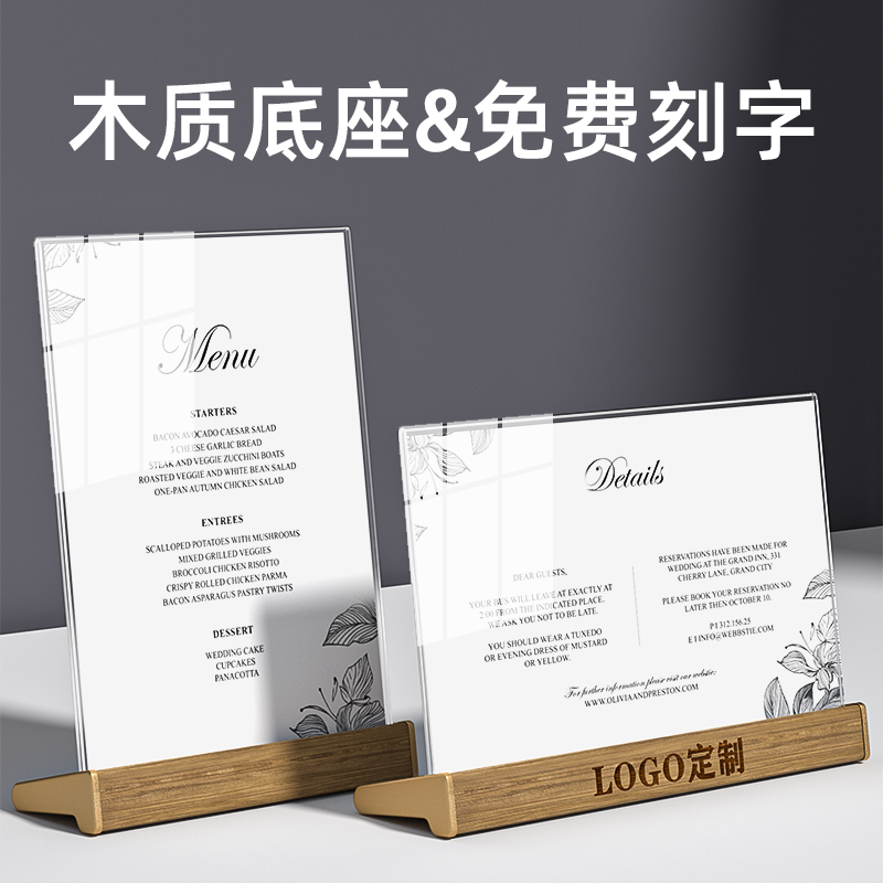 a4亚克力展示架台卡实木立牌胡桃木桌牌水晶摆台桌面透明立式 台签高档餐牌相框 台牌二维码