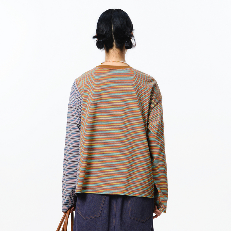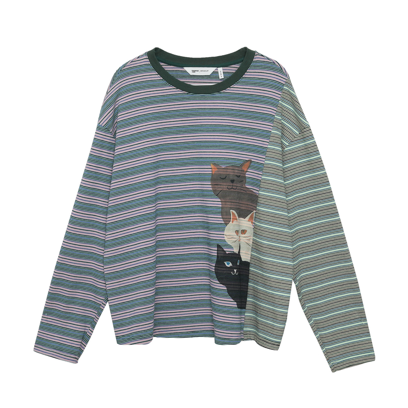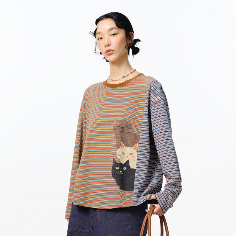 T恤女 .FUN系列沙点猫咪印花条纹短款 MOVEUP幻走2025秋季 新款