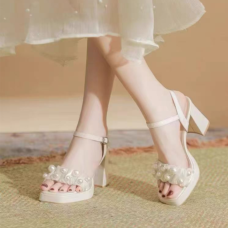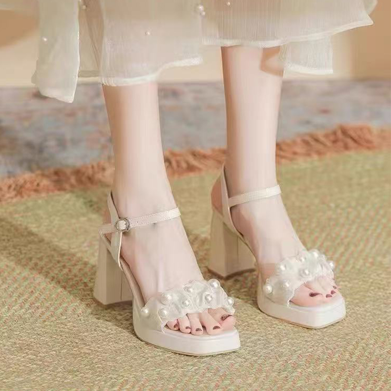 女 小个子珍珠丝绸露趾一字带粗跟防水台厚底高跟凉鞋 2025夏季 新款