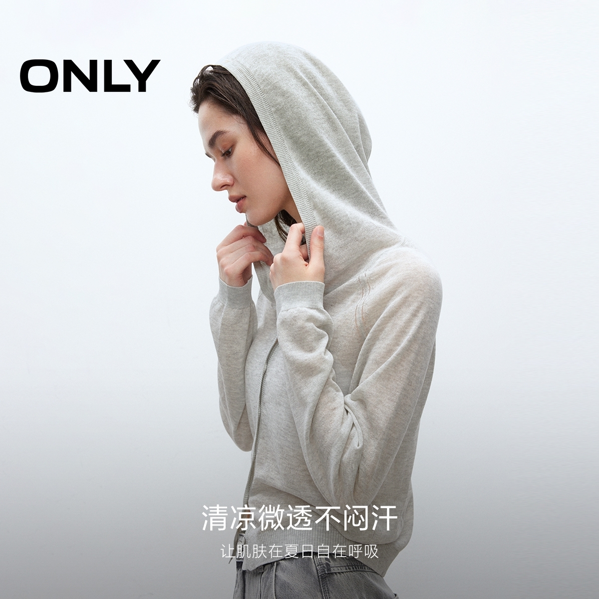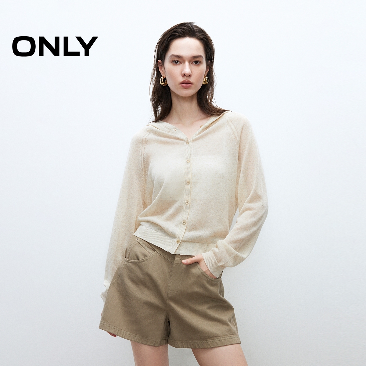 透气长袖 亚麻薄款 插肩袖 连帽纽扣开衫 女 ONLY2025秋季 针织衫 新款