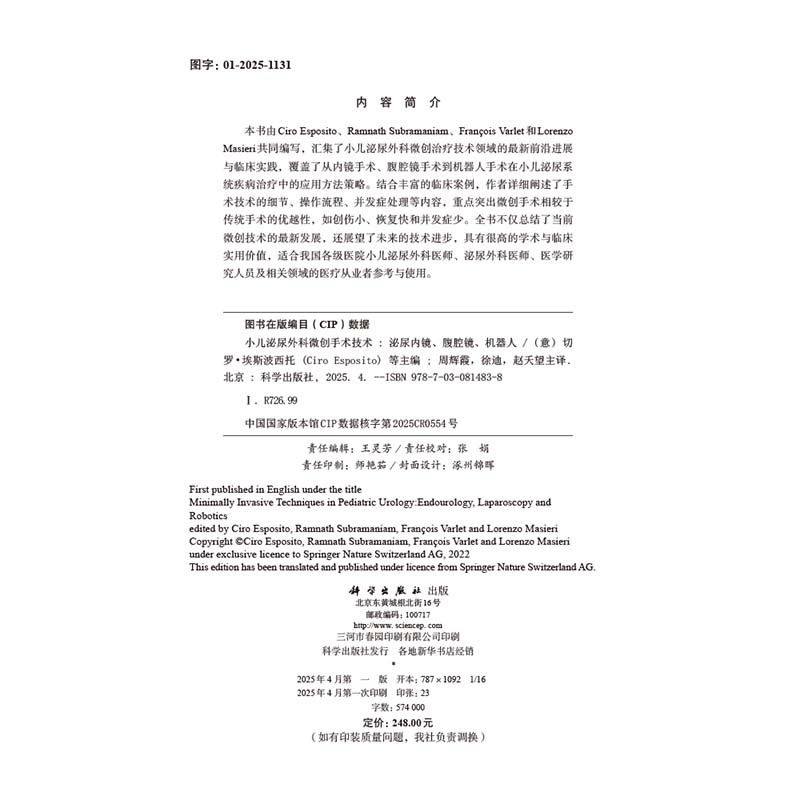 科学出版 小儿泌尿外科微创手术技术泌尿内镜腹腔镜机器人 等 周辉霞 社9787030814838 中文翻译版