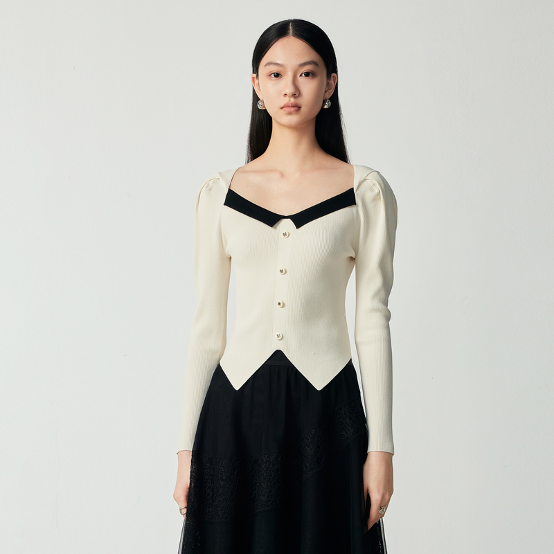 毛衫 长袖 撞色V型下摆酷感打底泡泡袖 H·GENTEEL荷高女装