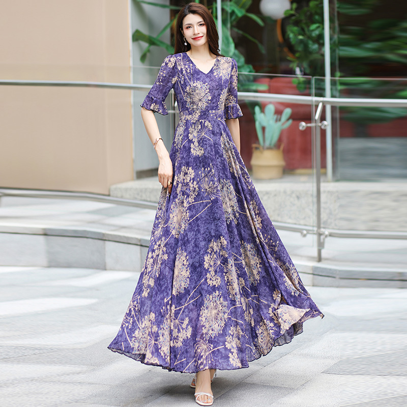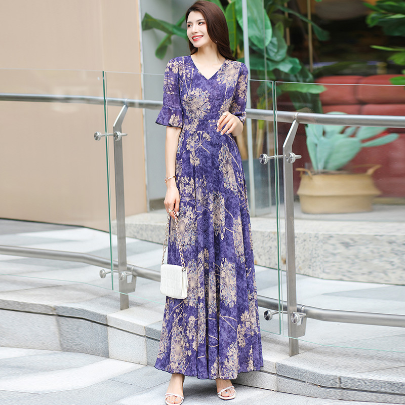 2025年秋冬新款 印花大摆连衣裙收腰显瘦旅游度假长裙雪纺裙沙滩裙