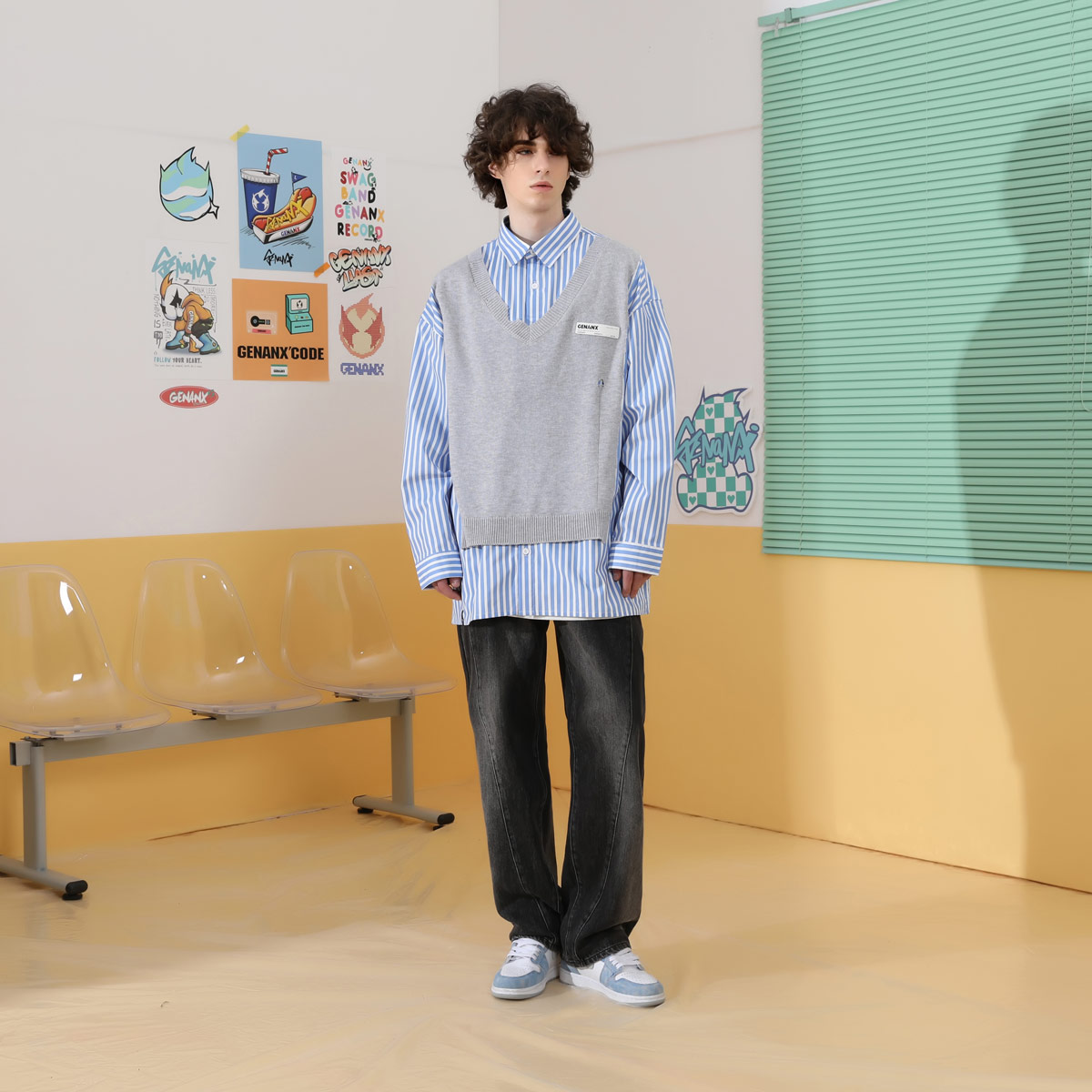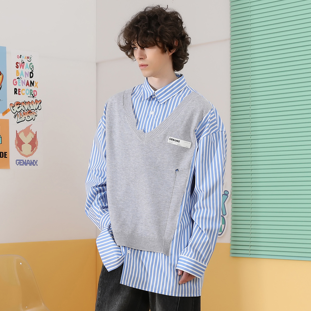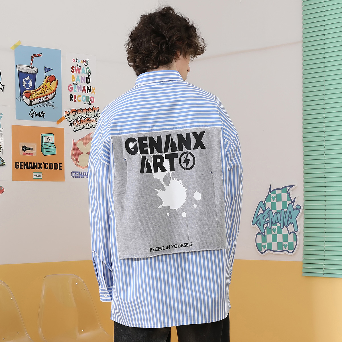 条纹宽松百搭 休闲衬衣假两件设计情侣衬衫 GENANX闪电潮牌秋季 新款