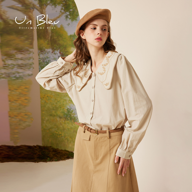 女宽松长袖 女装 秋装 日系高级时尚 绣花大翻领衬衣 新款 UnBleu白衬衫
