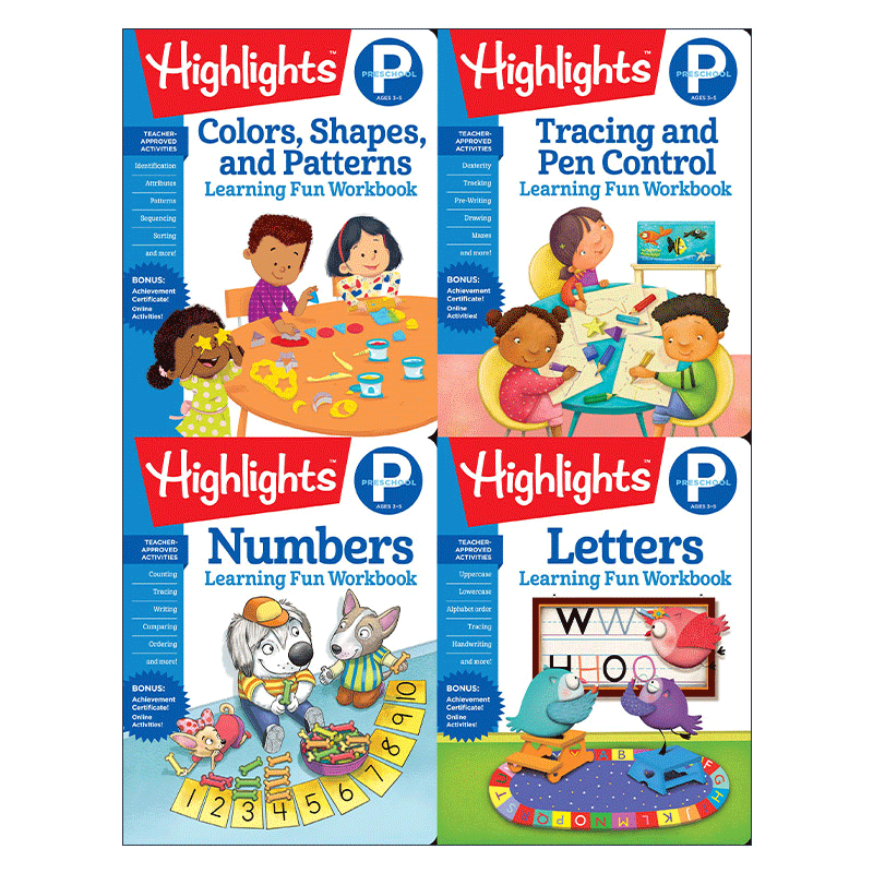 数字 进口英语书 Preschool Pack 颜色形状与图案 Workbook Highlights Learning 英文版 学前学习四册套装 描红与控笔 英文原版
