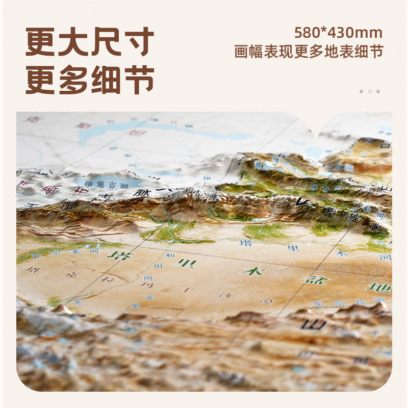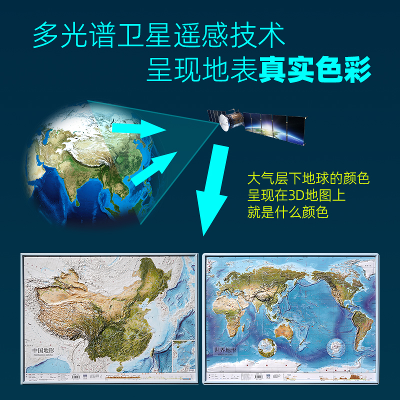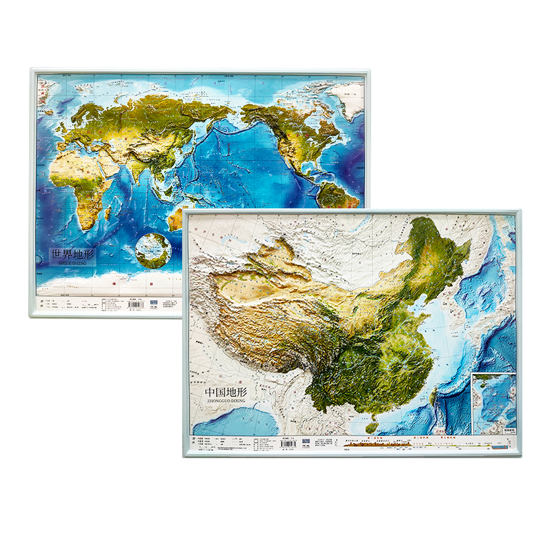 儿童房书房均可适用 卫星遥感影像沙盘浮雕地形图 世界和中国3d立体凹凸地图挂图58x43cm 专为中小学生学习地理打造