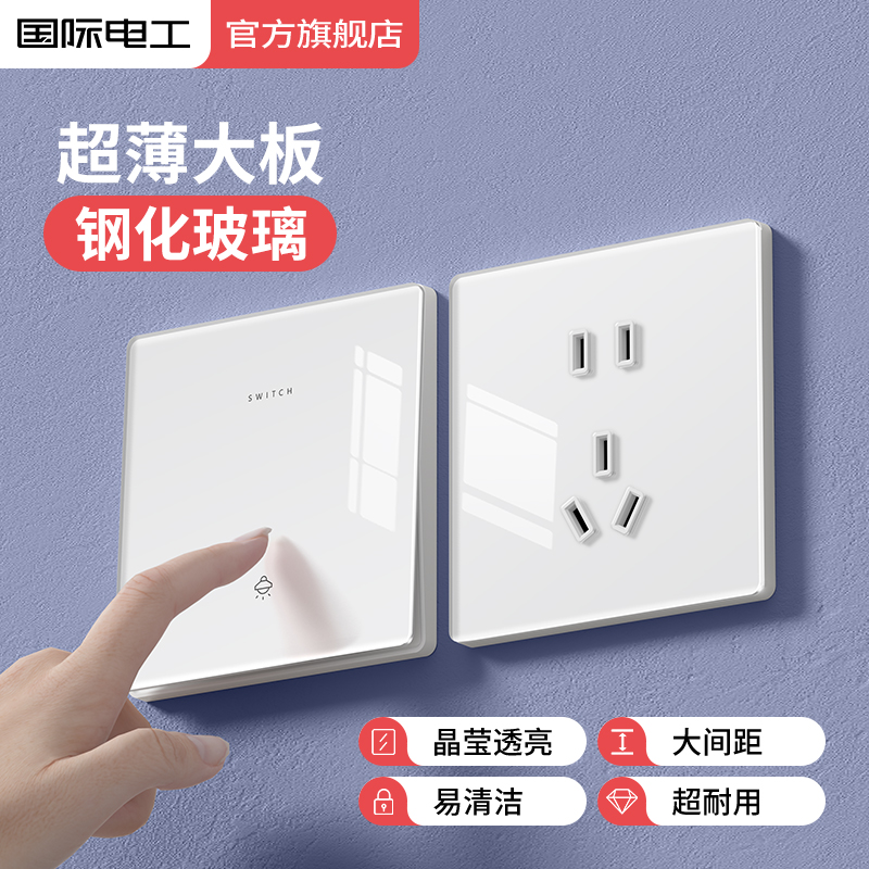 国际电工超薄钢化玻璃开关面板86型单开五孔插座正品 全屋定制 套装