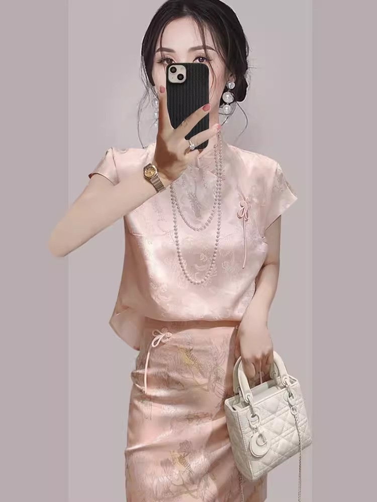 轻奢独特小众别致印花短袖 新款 上衣 女2025夏季 气质粉色仿真丝衬衫
