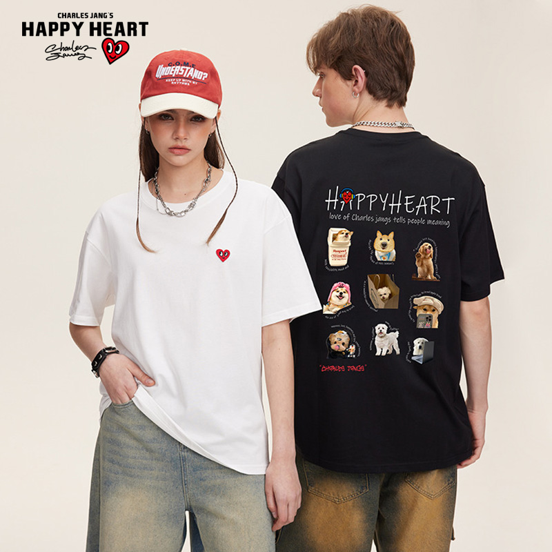 情侣百搭 圆领T恤小狗宠物男女同款 查尔斯桃心 印花纯棉短袖