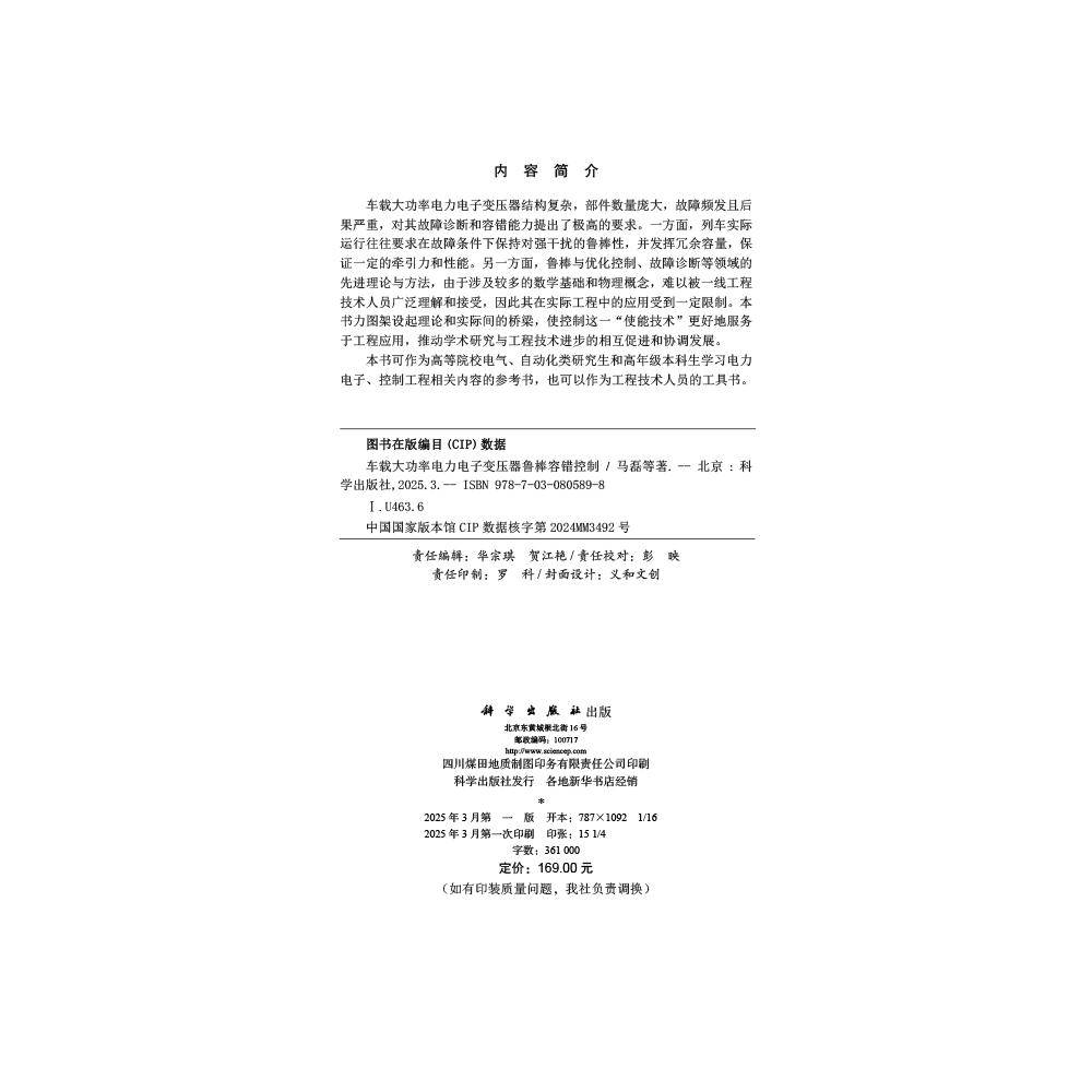车载大功率电力电子变压器鲁棒容错控制科学出版 社