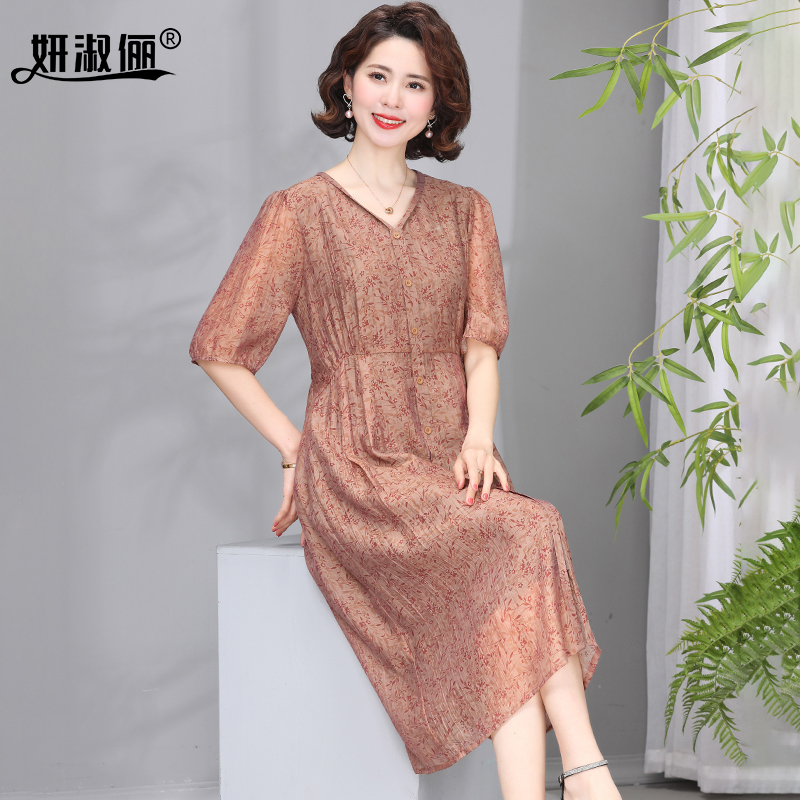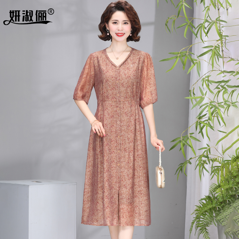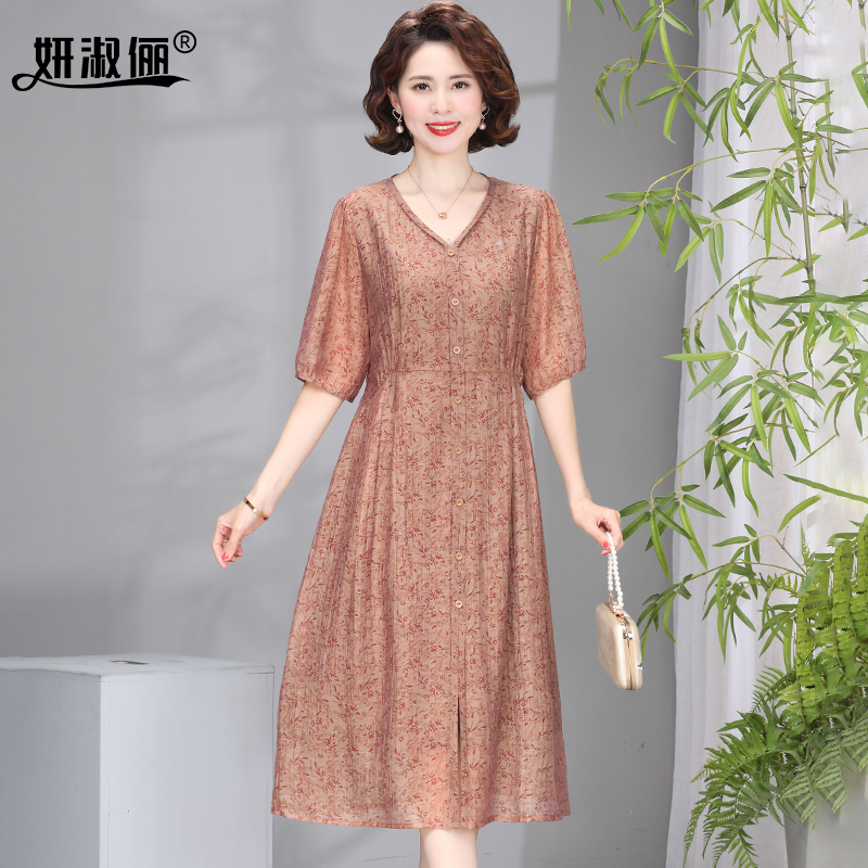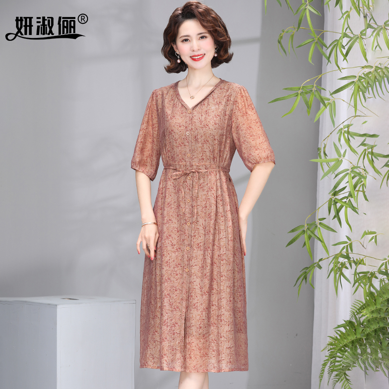 天丝亚麻连衣裙女大牌端庄印花高档次2025年新款 裙子 气质妈妈夏装