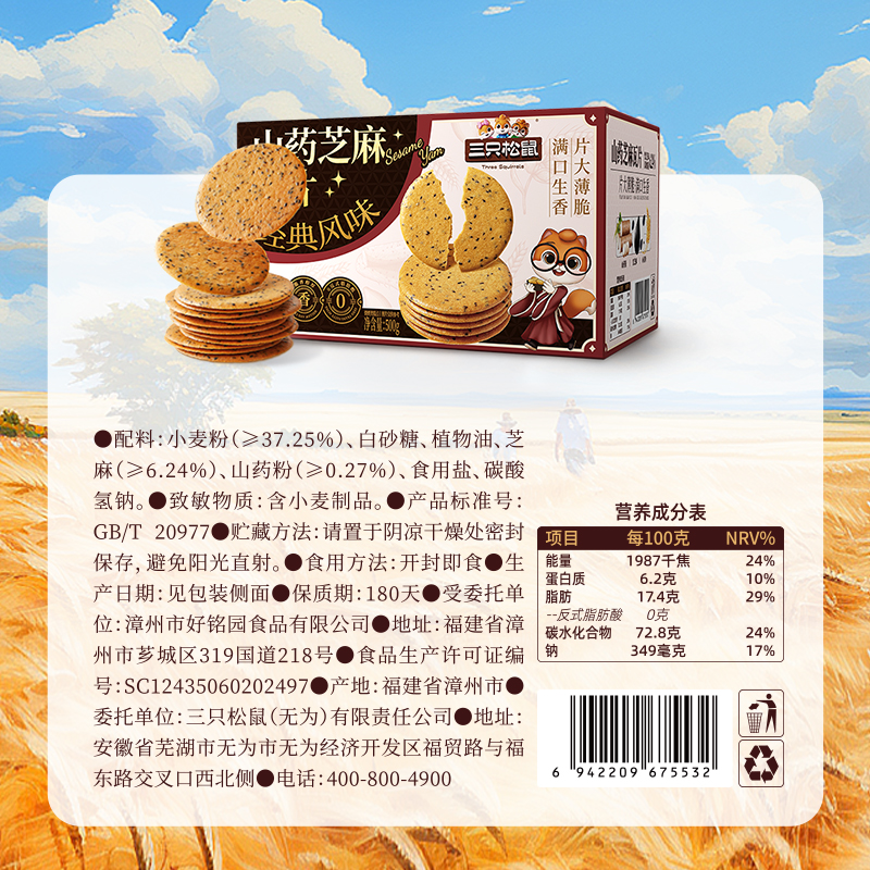 三只松鼠山药芝麻瓦片500g薄脆饼干膨化解馋怀旧零食 满99减30
