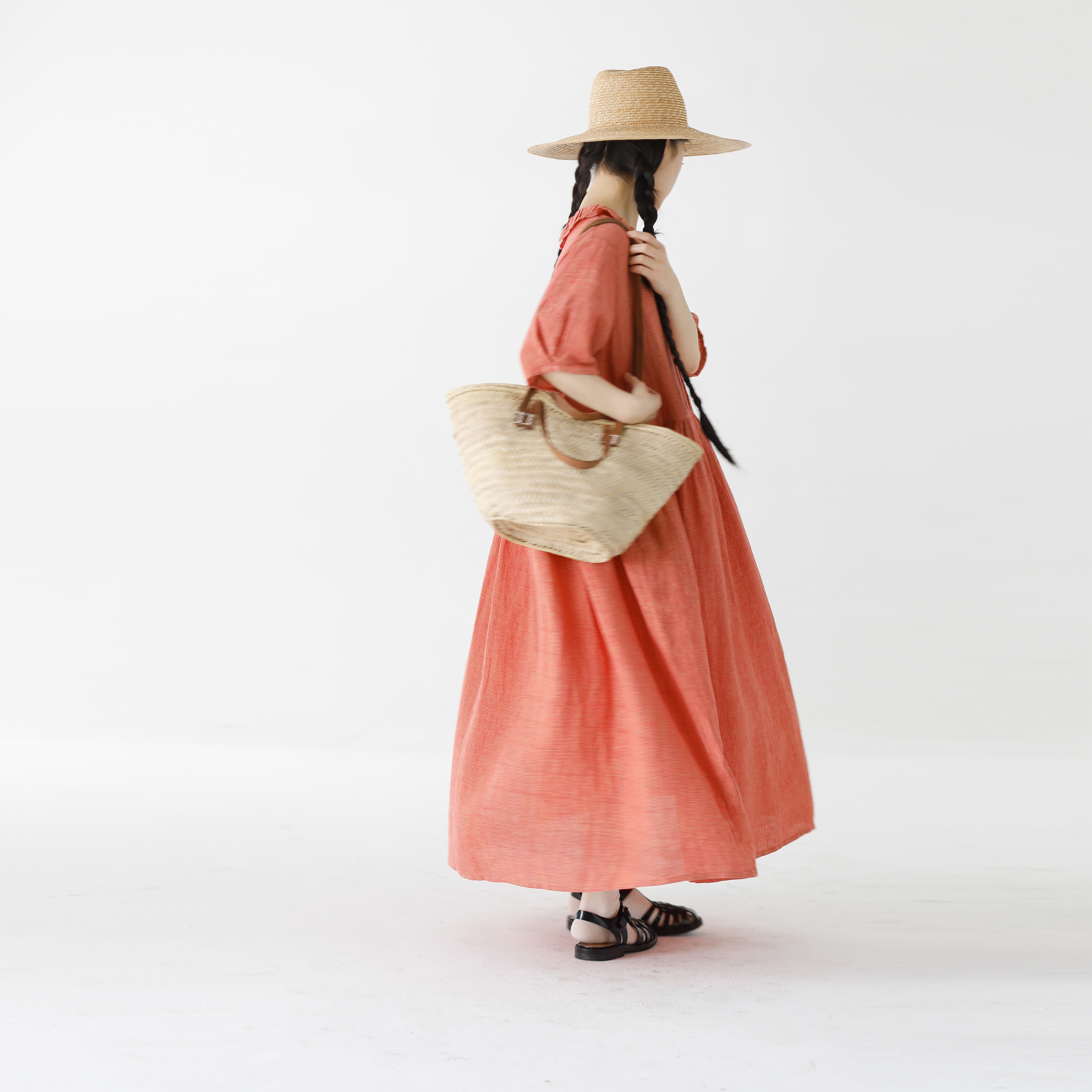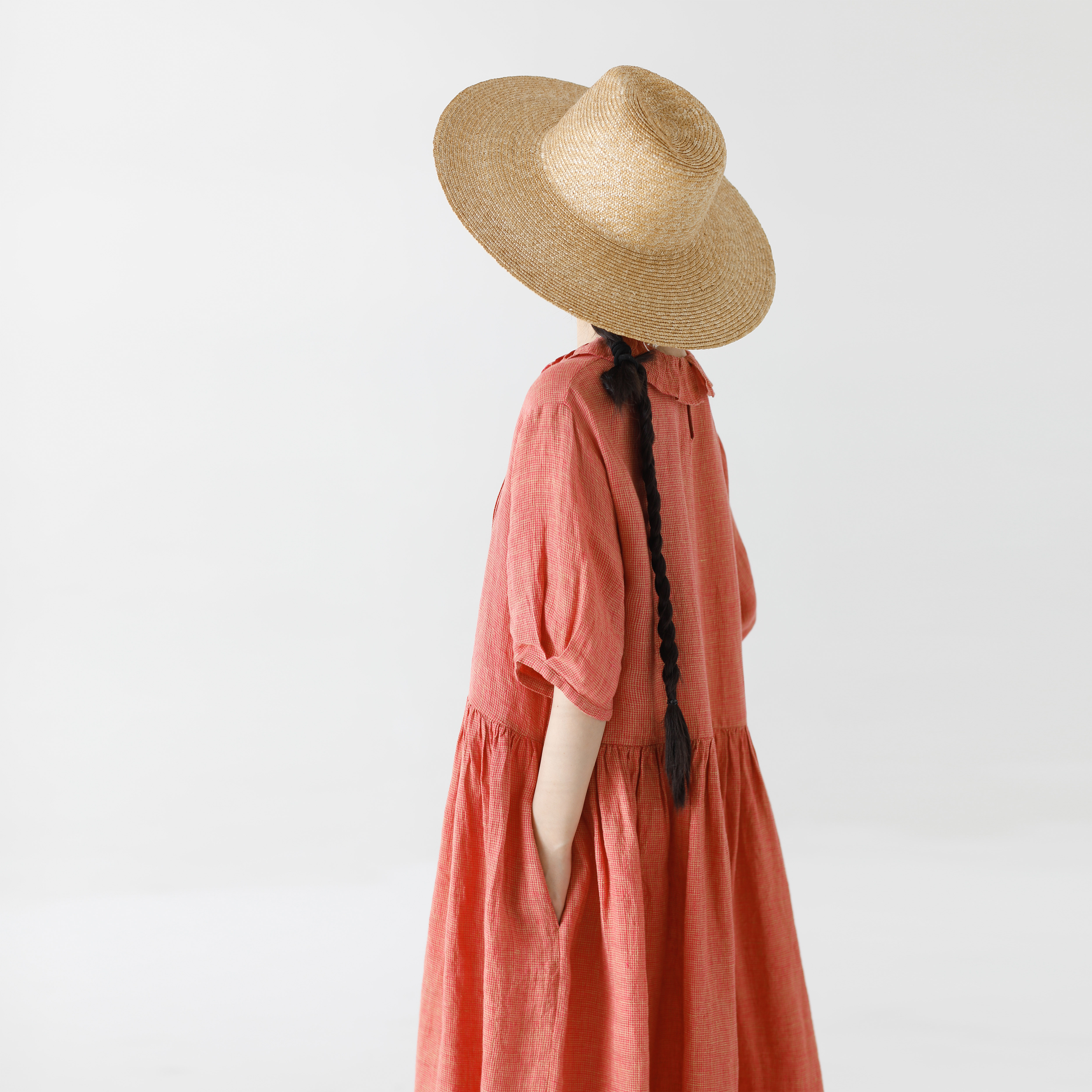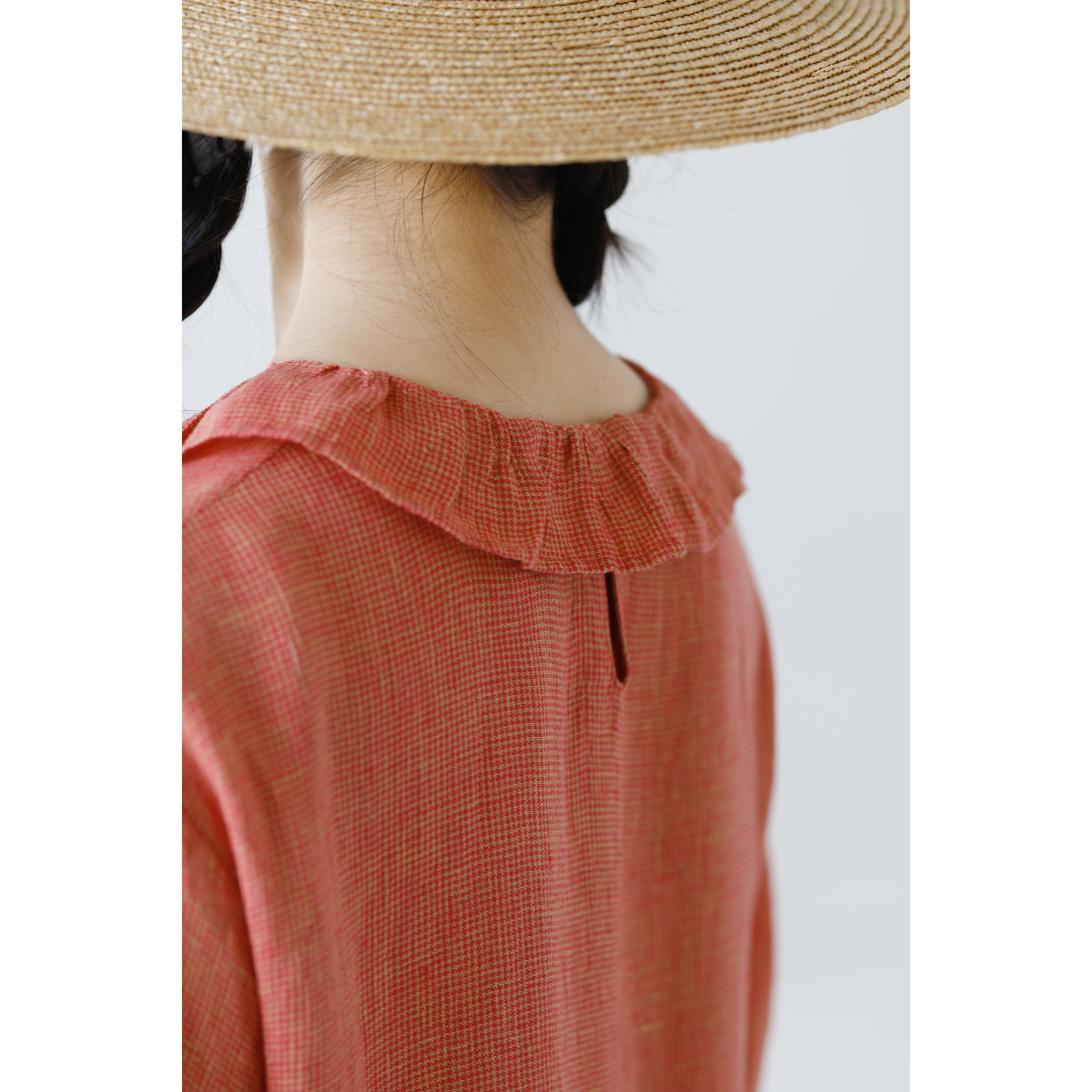 复述色织亚麻红橙小千鸟格长裙 大摆连衣裙 胸口压褶花边翻领短袖