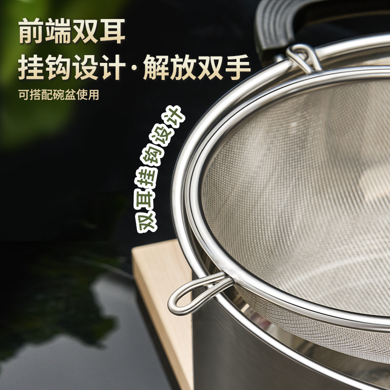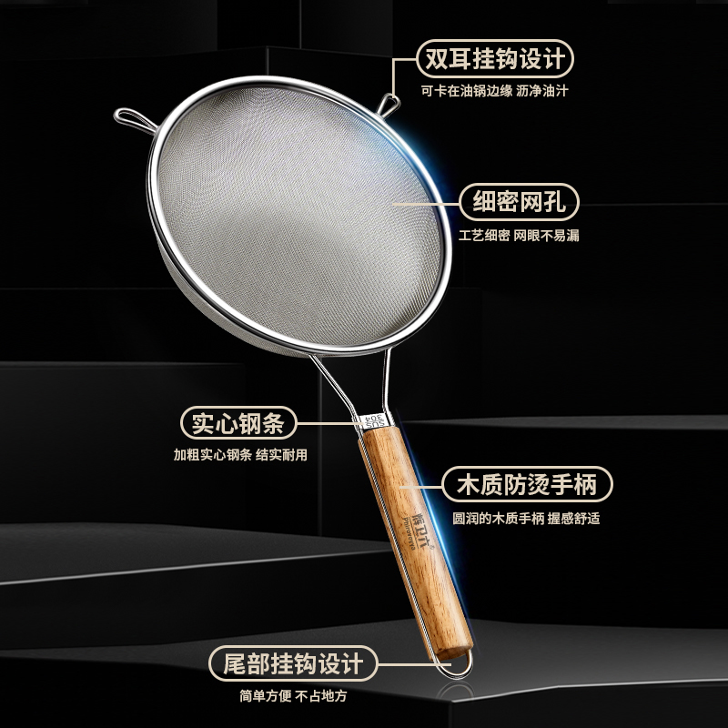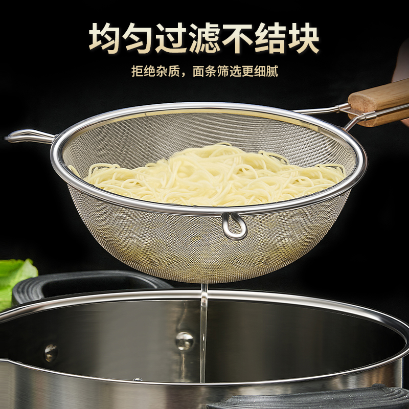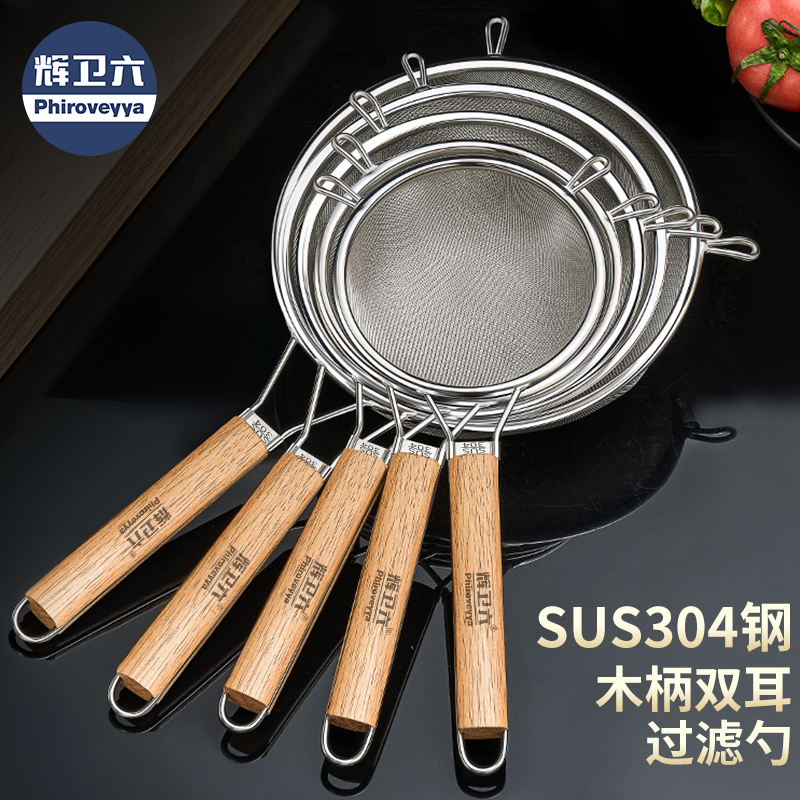辉卫六双耳304不锈钢木柄漏勺厨房隔渣过滤网筛面粉豆浆细网漏网