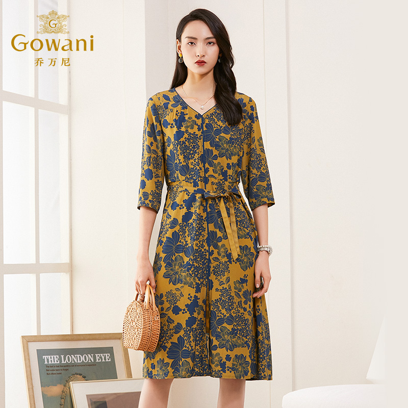 裙子DDS4LD5178 宽松长袖 播优雅圆领拼接连衣裙女25秋季 新款
