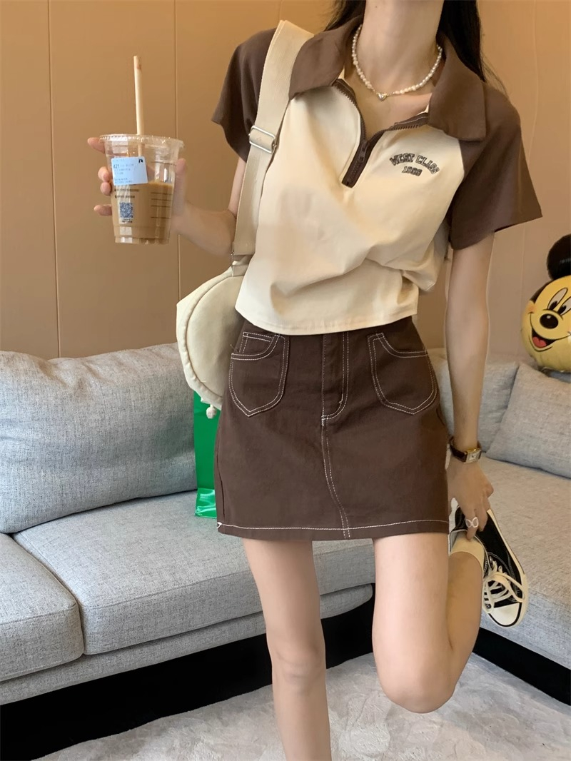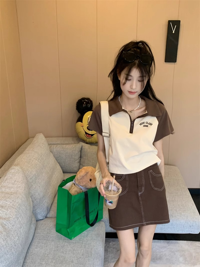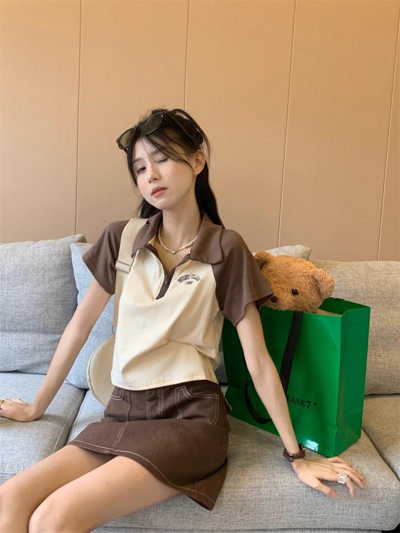 打底小衫 美式 短款 T恤女夏天外穿修身 撞色上衣 高街潮牌POLO领短袖