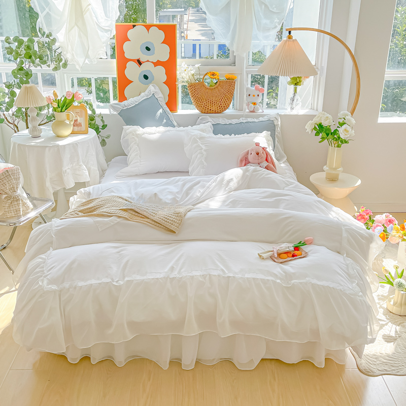 2025新公主风白纱床裙款 纯色水洗棉床上用品 四件套床罩被套春夏季