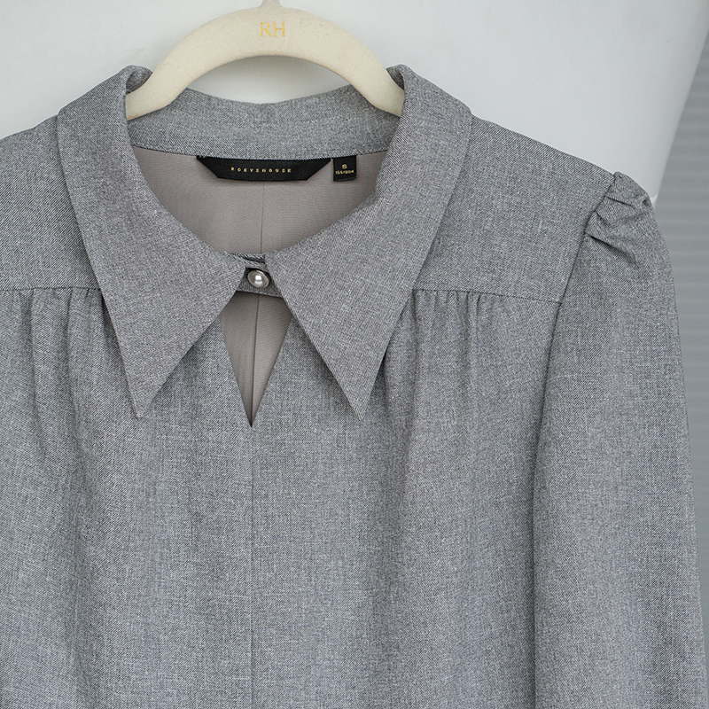 大摆中长裙08135 灰色泡泡袖 罗衣知性翻领褶皱连衣裙2025秋季 新款