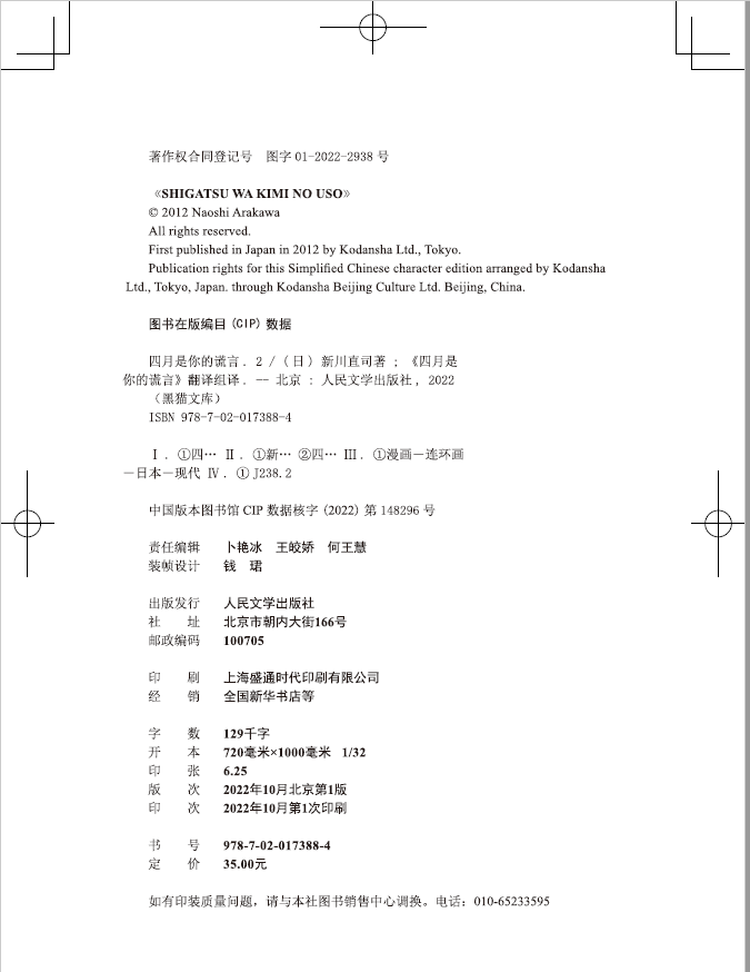 有马公生花江夏树 社 四月是你 人民文学出版 ANIPLEX讲谈社 宫园薰种田梨沙 豆瓣9.0原作漫画简体中文 新川直司 谎言2 包邮 正版