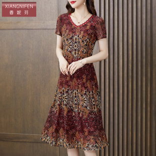 香妮芬复古收腰气质中年妈妈连衣裙女2025新款 台湾纱V领裙子 夏季