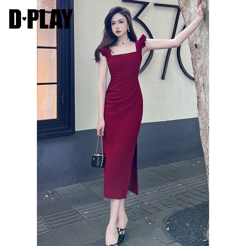 吊带连衣裙长裙女裙子 红色捏褶弹力飞飞袖 DPLAY2025夏装 气质法式