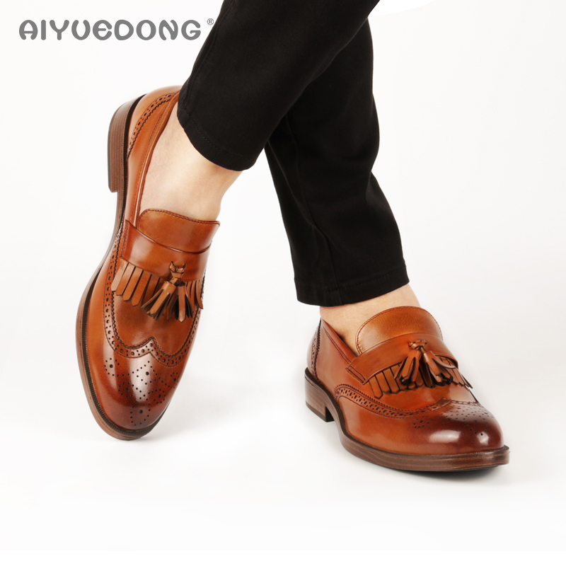 透气真皮流苏一脚蹬套脚乐福鞋 秋季 男士 布洛克商务休闲皮鞋 男 新款