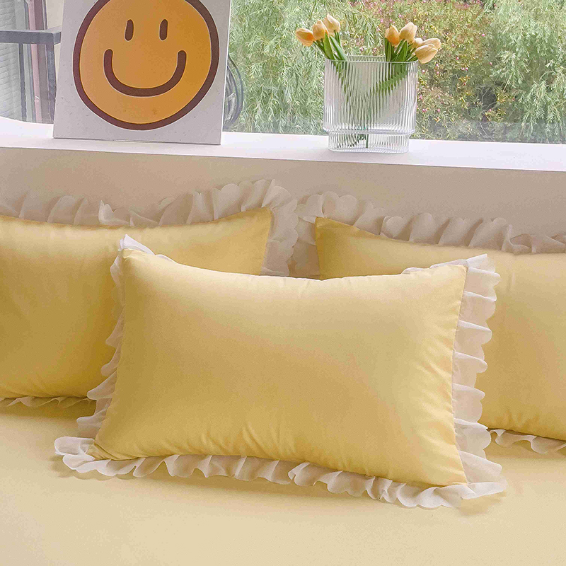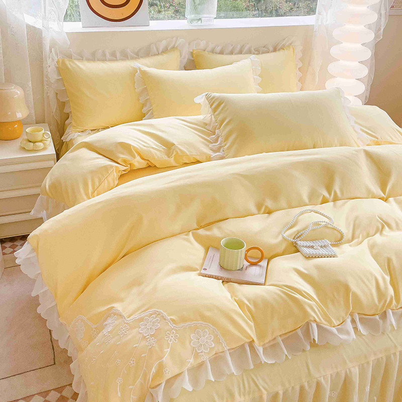 韩式 四件套蕾丝被套少女心全纯色床单水洗棉床上用品 公主风床裙款