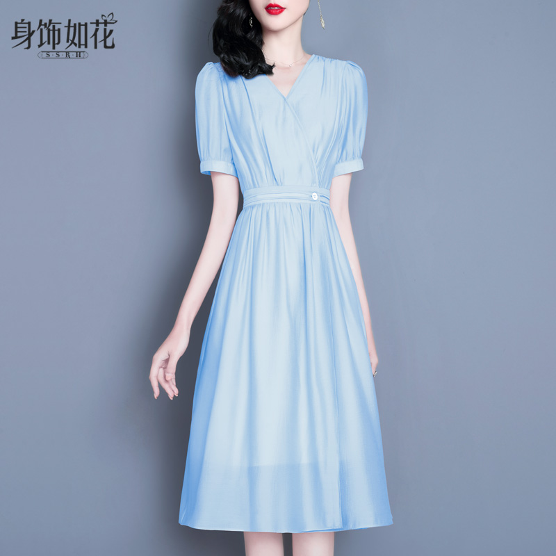 新款 短袖 淑女装 显瘦气质名媛a字裙中长款 蓝色连衣裙 修身 2025夏季