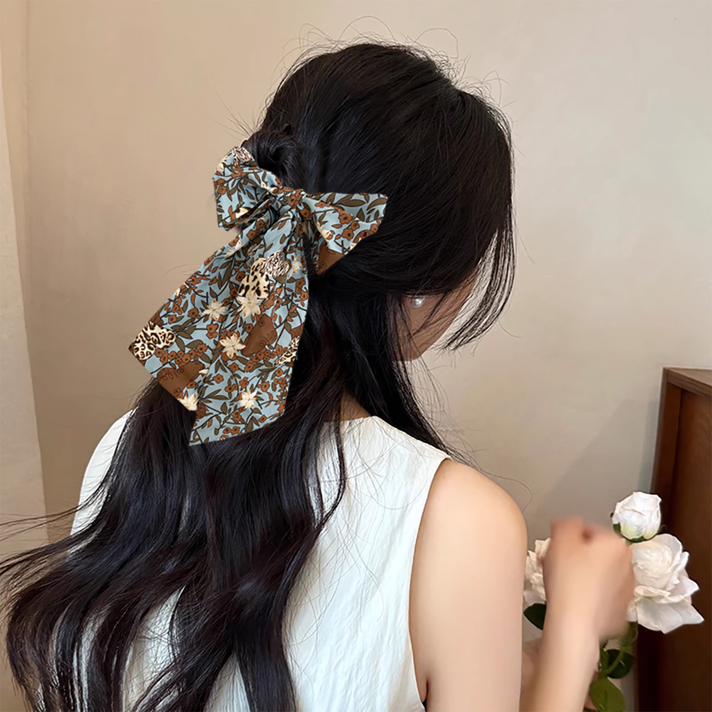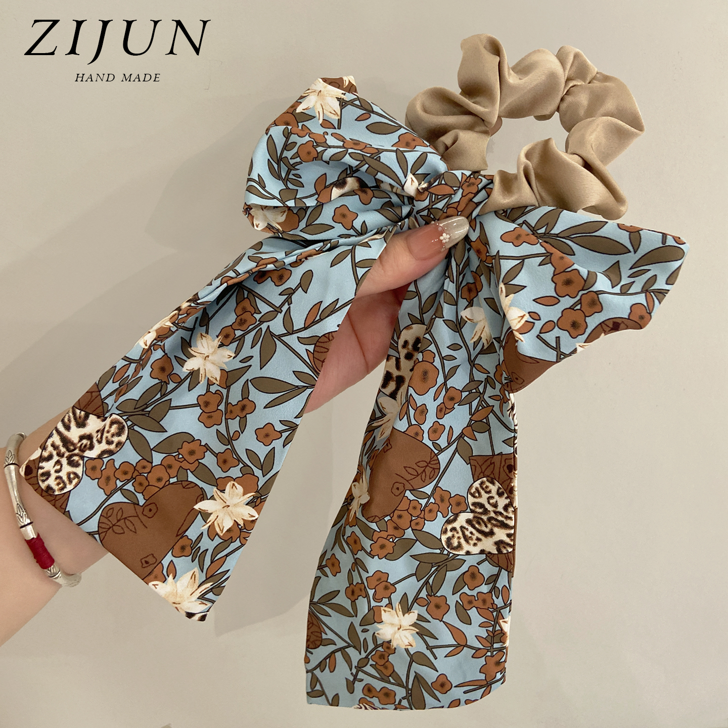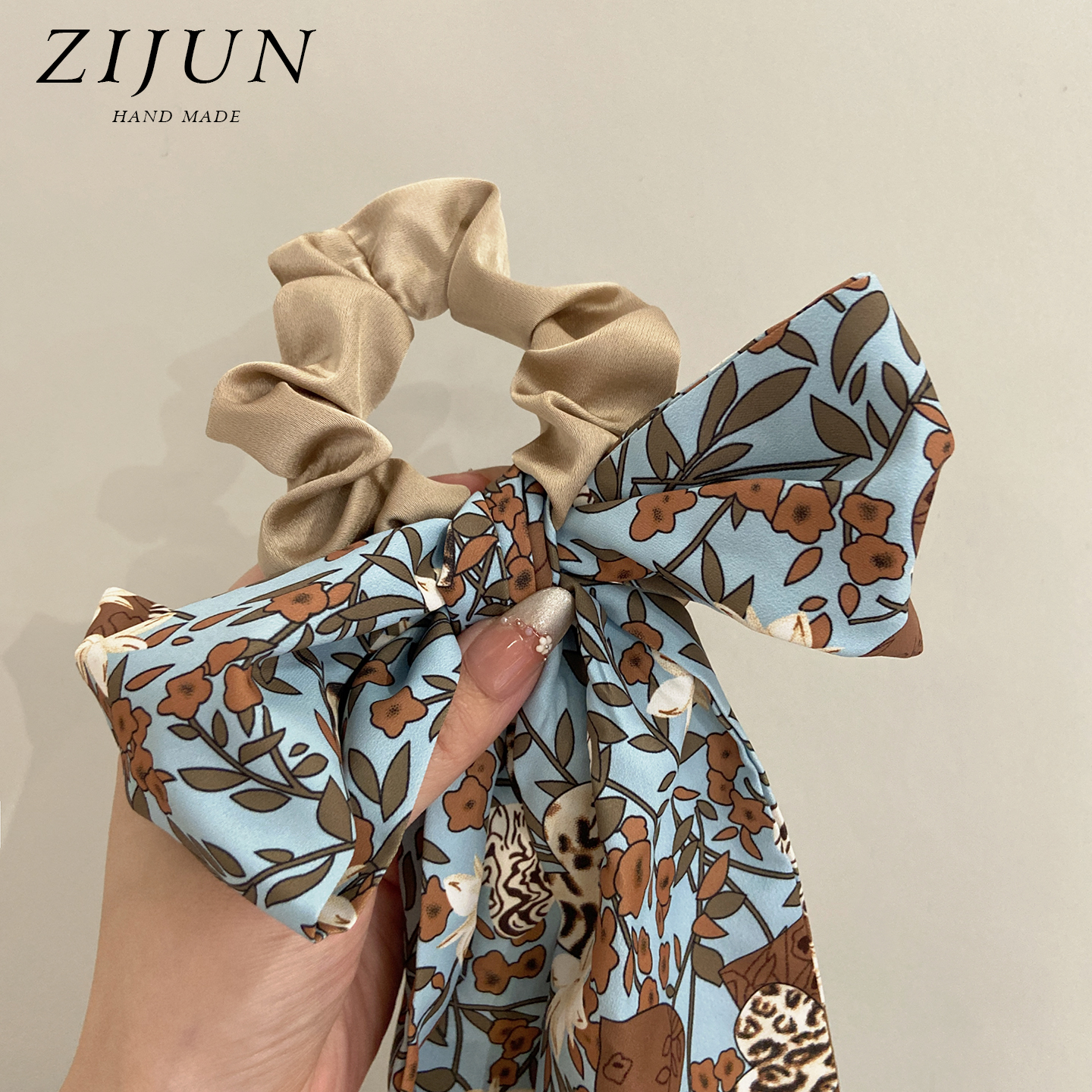 韩国高级感印花飘带缎面马尾发圈头绳女复古头饰品扎头蝴蝶结发绳