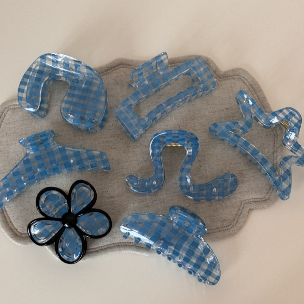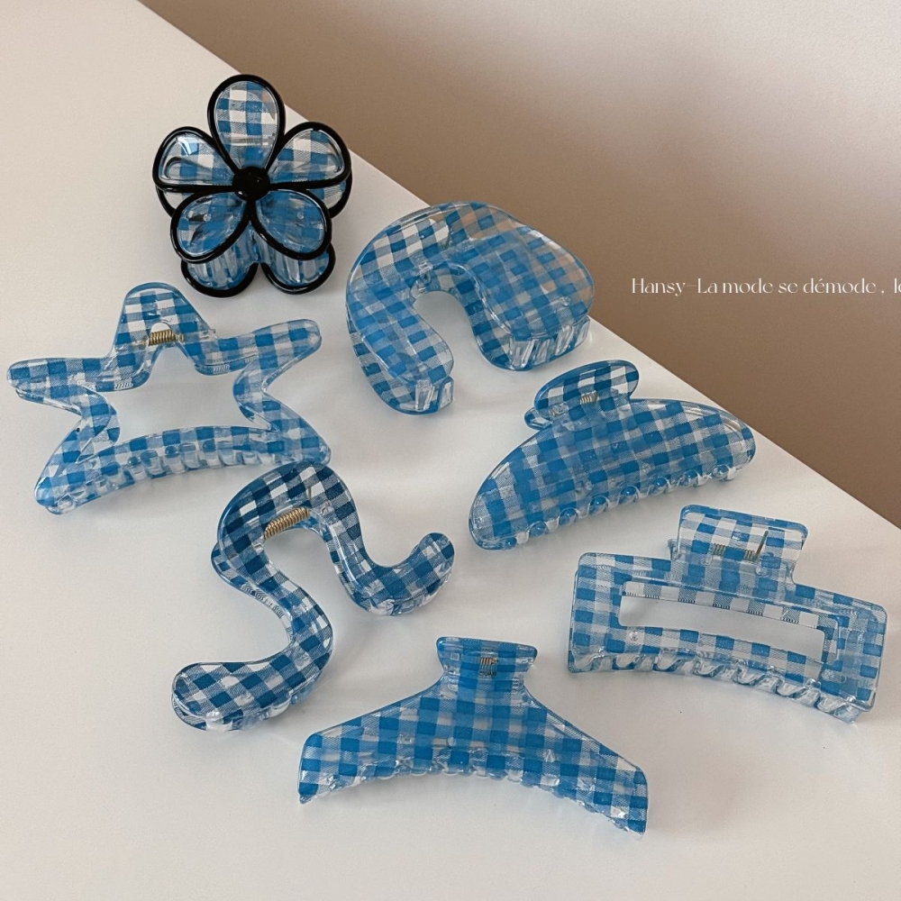 盘发器 小众鲨鱼夹后脑勺发饰新品 雨后清晨 设计感蓝色格子抓夹