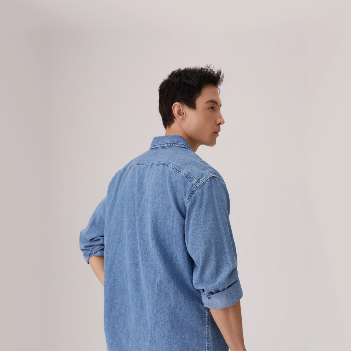 男2025秋款 衬衫 宽松休闲上衣复古水洗牛仔外套 森马长袖 森柔牛仔